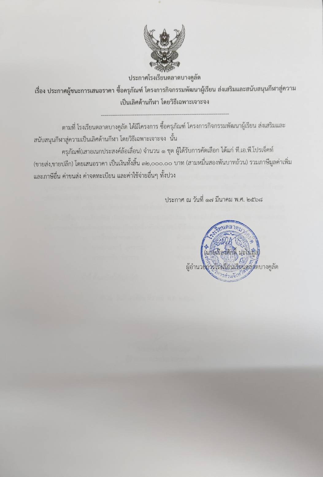 ประกาศจัดซื้อจัดจ้าง โรงเรียนตลาดบางคูลัด เรื่อง ประกาศผู้ชนะการเสนอราคา จัดซื้อครุภัณฑ์ (โครงการกิจกรรมพัฒนาผู้เรียน ส่งเสริมและสนับสนุนกีฬา สู่ความเป็นเลิศด้านกีฬา) ประจำปีงบประมาณ 2568 (ฏีกา 46/2568)