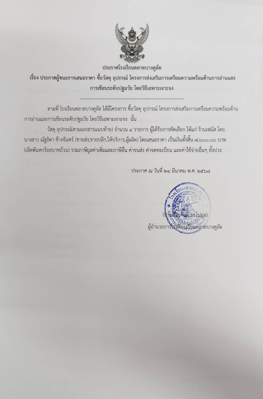 ประกาศจัดซื้อจัดจ้าง โรงเรียนตลาดบางคูลัด เรื่อง ประกาศผู้ชนะการเสนอราคา จัดซื้อวัสดุอุปกรณ์ (โครงการส่งเสริมการเตรียมความพร้อมด้านการอ่านการเขียนปฐมวัย) ประจำปีงบประมาณ 2568 (ฏีกา 55/2568)