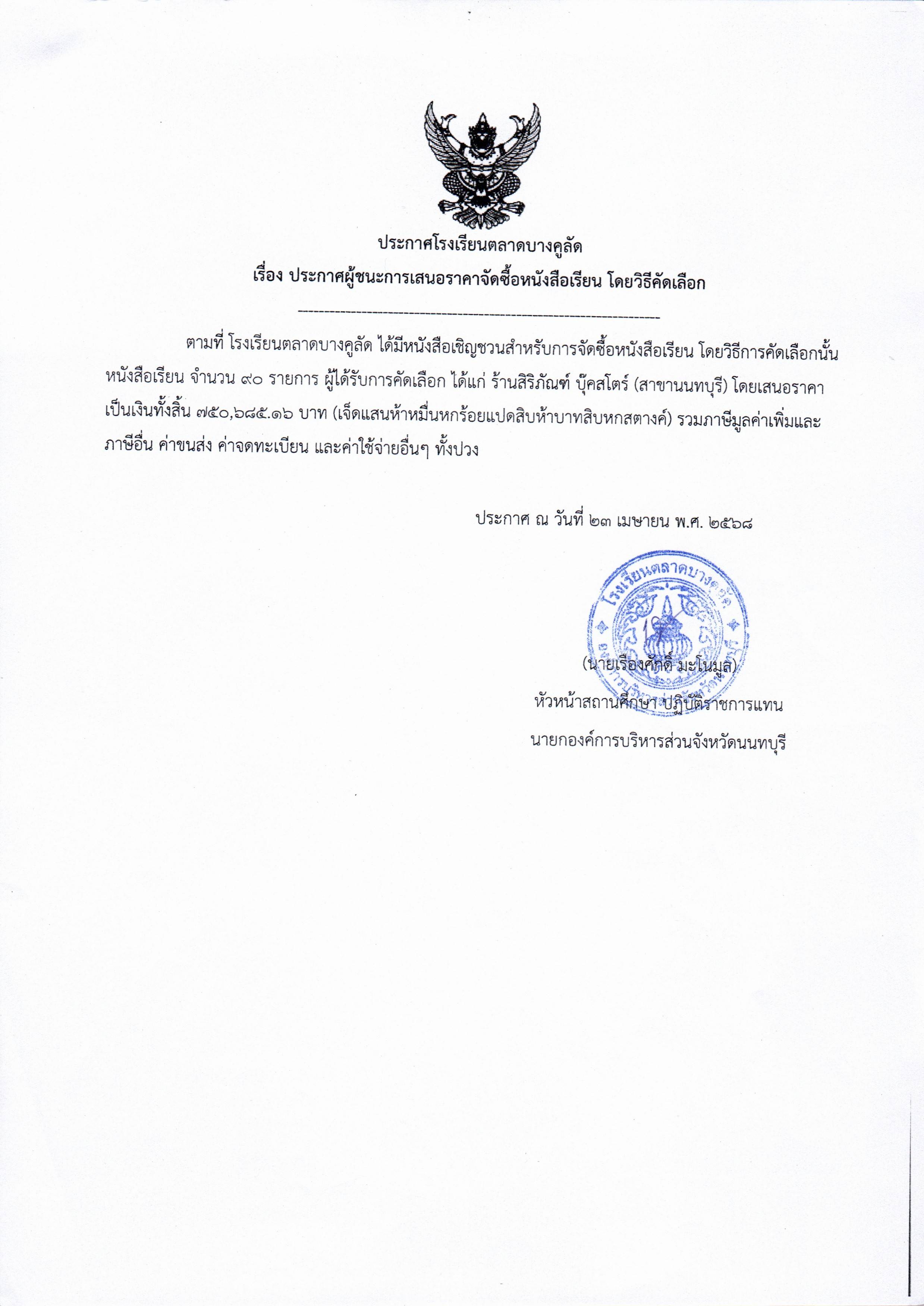 ประกาศจัดซื้อจัดจ้าง โรงเรียนตลาดบางคูลัด เรื่อง ประกาศผู้ชนะการเสนอราคา จัดซื้อหนังสือเรียน (โครงการจัดซื้อหนังสือเรียน) ประจำปีงบประมาณ 2568 (ฏีกา 64/2568)