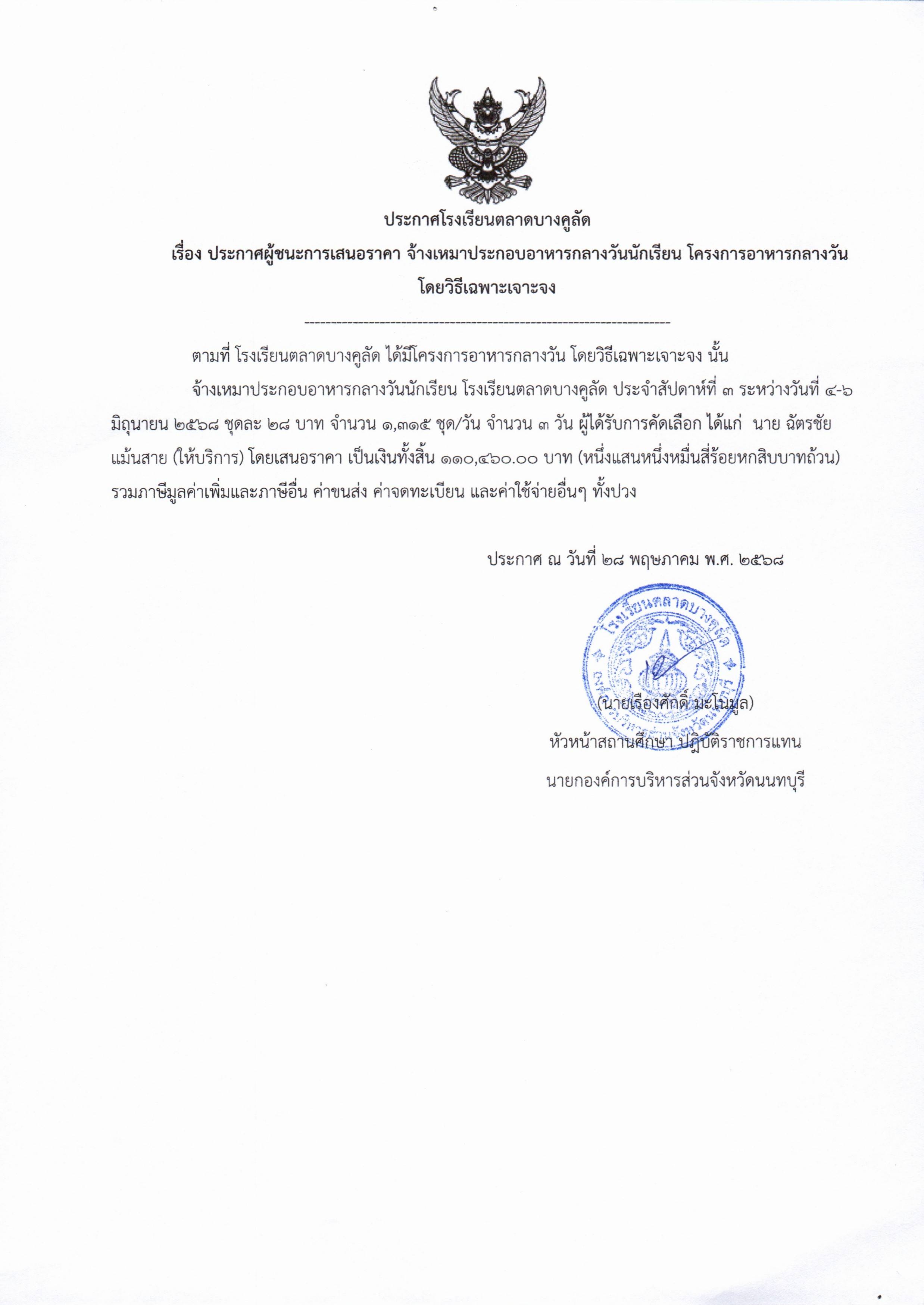 ประกาศจัดซื้อจัดจ้าง โรงเรียนตลาดบางคูลัด เรื่อง ประกาศผู้ชนะการเสนอราคา การจ้างเหมาบริการจัดทำอาหารกลางวัน (โครงการอาหารกลางวันนักเรียน) ประจำปีงบประมาณ 2568 (ฏีกา 70/2568)