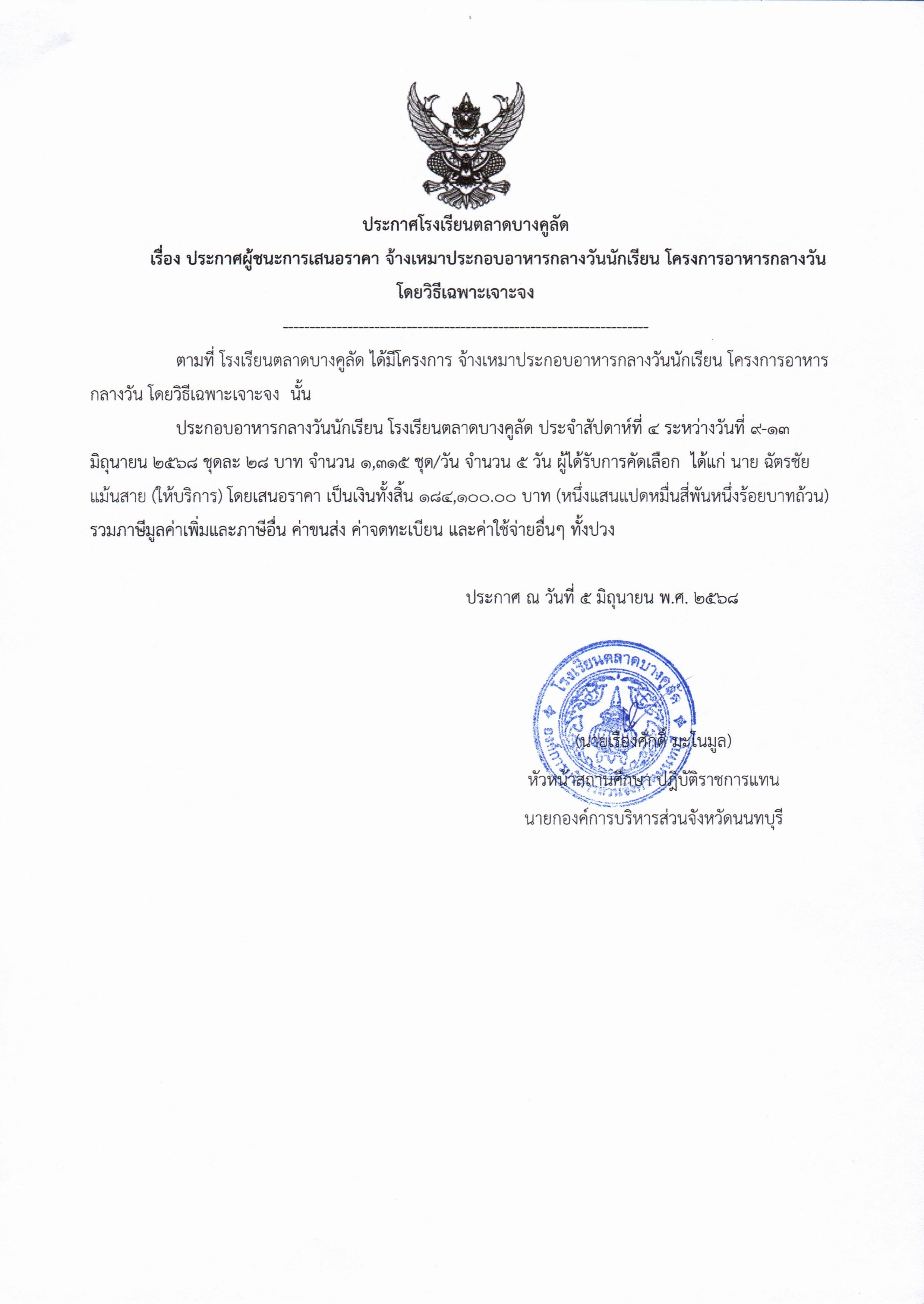 ประกาศจัดซื้อจัดจ้าง โรงเรียนตลาดบางคูลัด เรื่อง ประกาศผู้ชนะการเสนอราคา การจ้างเหมาบริการจัดทำอาหารกลางวัน (โครงการอาหารกลางวันนักเรียน) ประจำปีงบประมาณ 2568 (ฏีกา 71/2568)