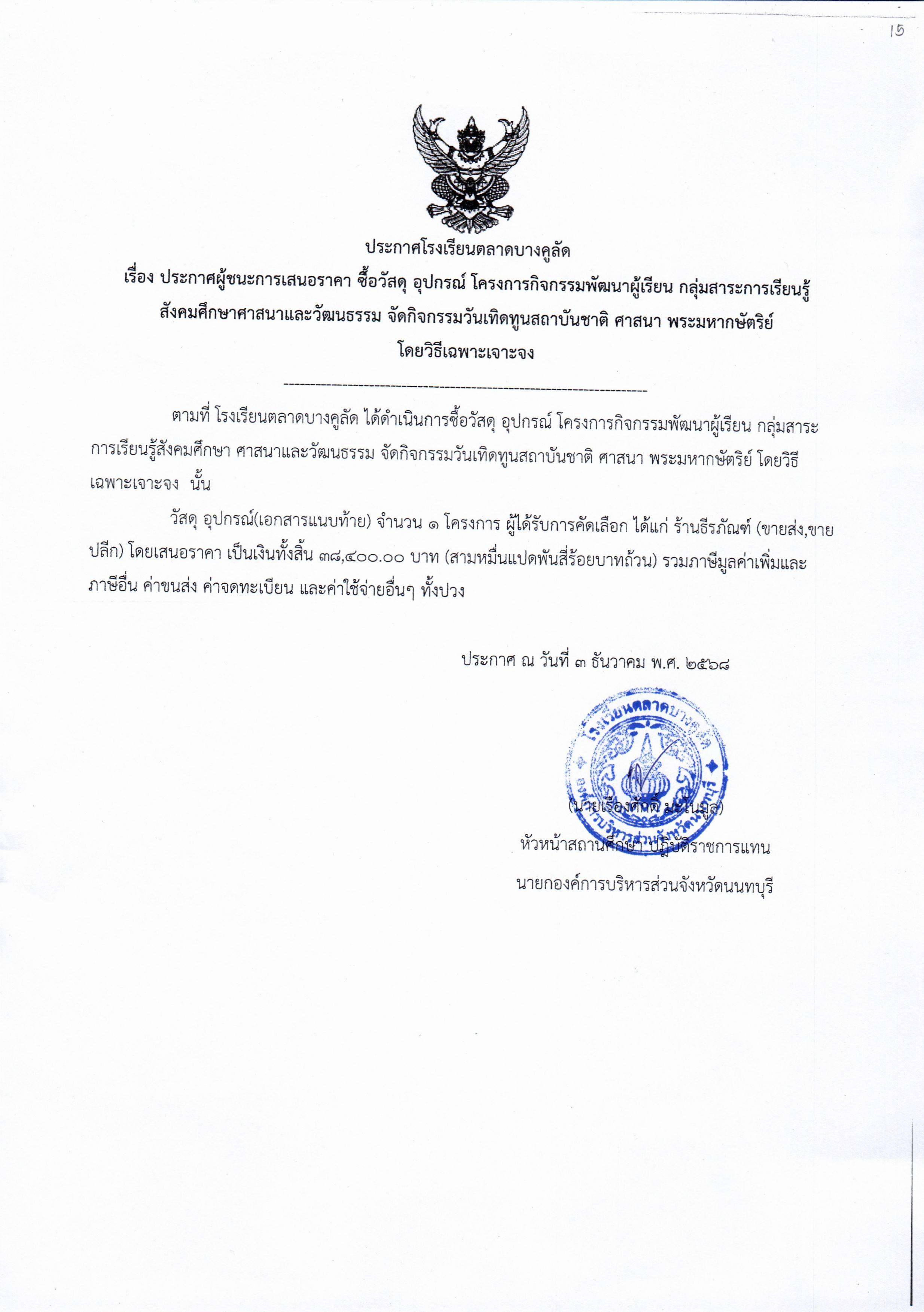 โรงเรียนตลาดบางคูลัด เรื่อง ประกาศผู้ชนะการเสนอราคา ซื้อวัสดุ อุปกรณ์ โครงการกิจกรรมพัฒนาผู้เรียน กลุ่มสาระการเรียนรู้สังคมศึกษาศาสนาและวัฒนธรรม จัดกิจกรรมวันเทิดทูนสถาบันชาติ ศาสนา พระมหากษัตริย์ ประจำปีงบประมาณ 2569 (ฏีกา 15/2569)