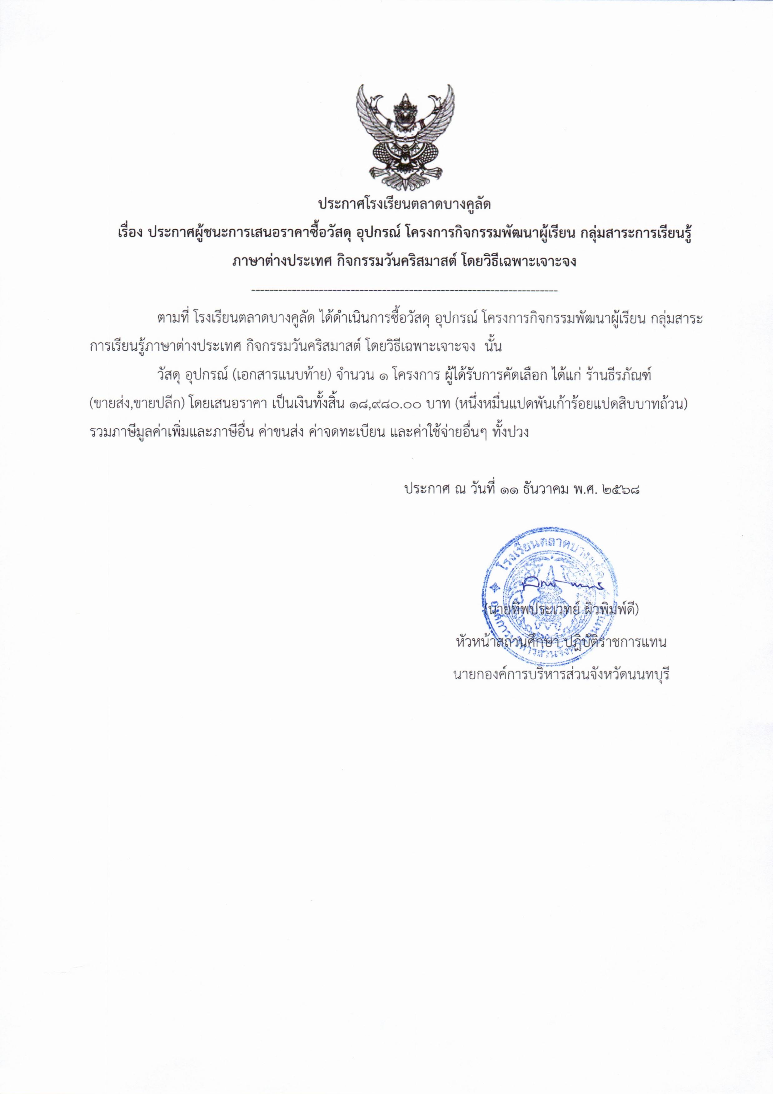 ประกาศจัดซื้อจัดจ้าง โรงเรียนตลาดบางคูลัด เรื่อง ประกาศผู้ชนะการเสนอราคา จัดซื้อวัสดุอุปกรณ์ (โครงการกิจกรรมพัฒนาผู้เรียน กลุ่มสาระการเรียนรู้ภาษาต่างประเทศ กิจกรรมวันคริสมาสต์ ) ประจำปีงบประมาณ 2568 (ฏีกา 19/2569)