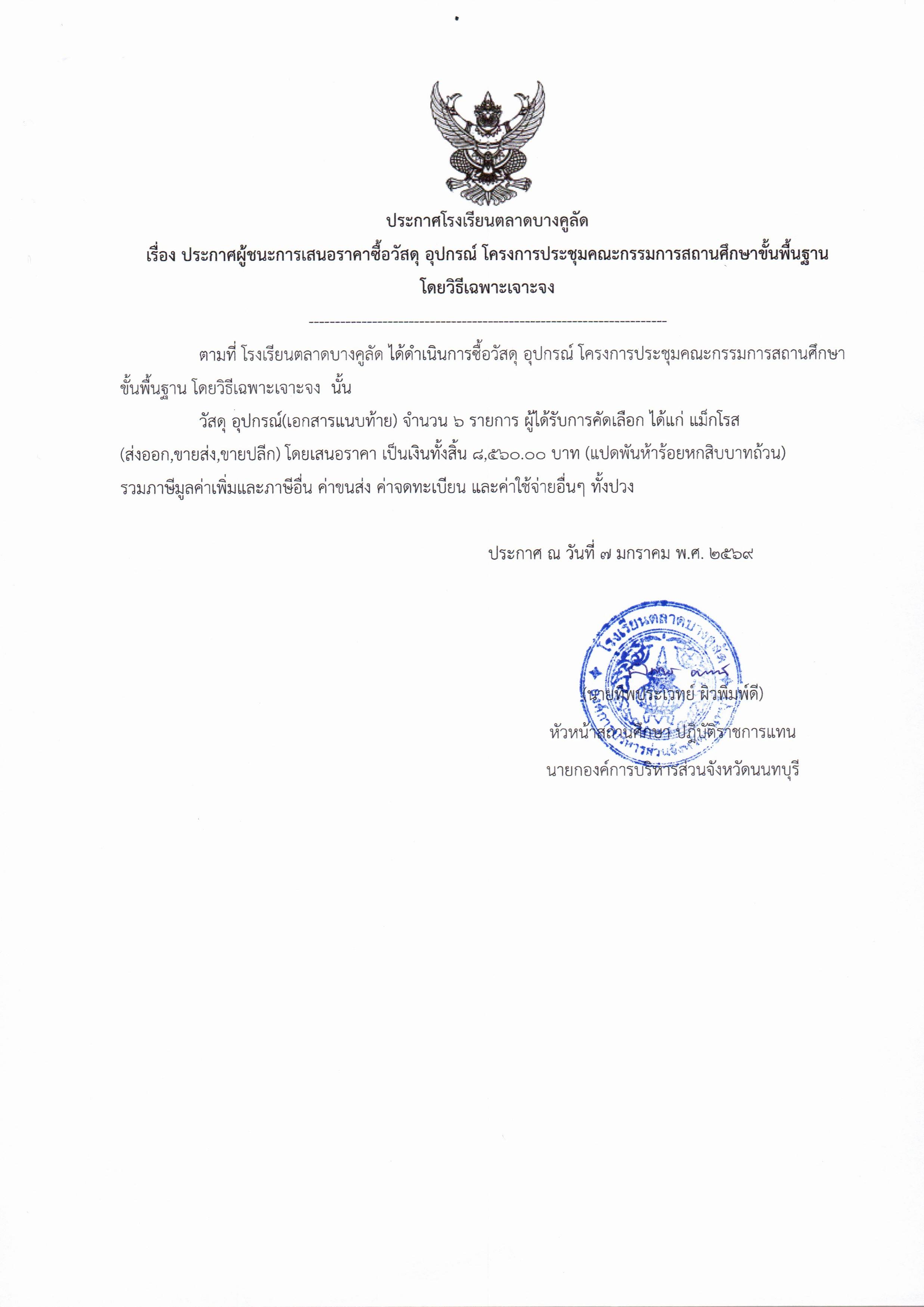 โรงเรียนตลาดบางคูลัด เรื่อง ประกาศผู้ชนะการเสนอราคา ซื้อวัสดุ อุปกรณ์ โครงการประชุมคณะกรรมการสถานศึกษาขั้นพื้นฐาน ประจำปีงบประมาณ 2569 (ฏีกา 28/2569)