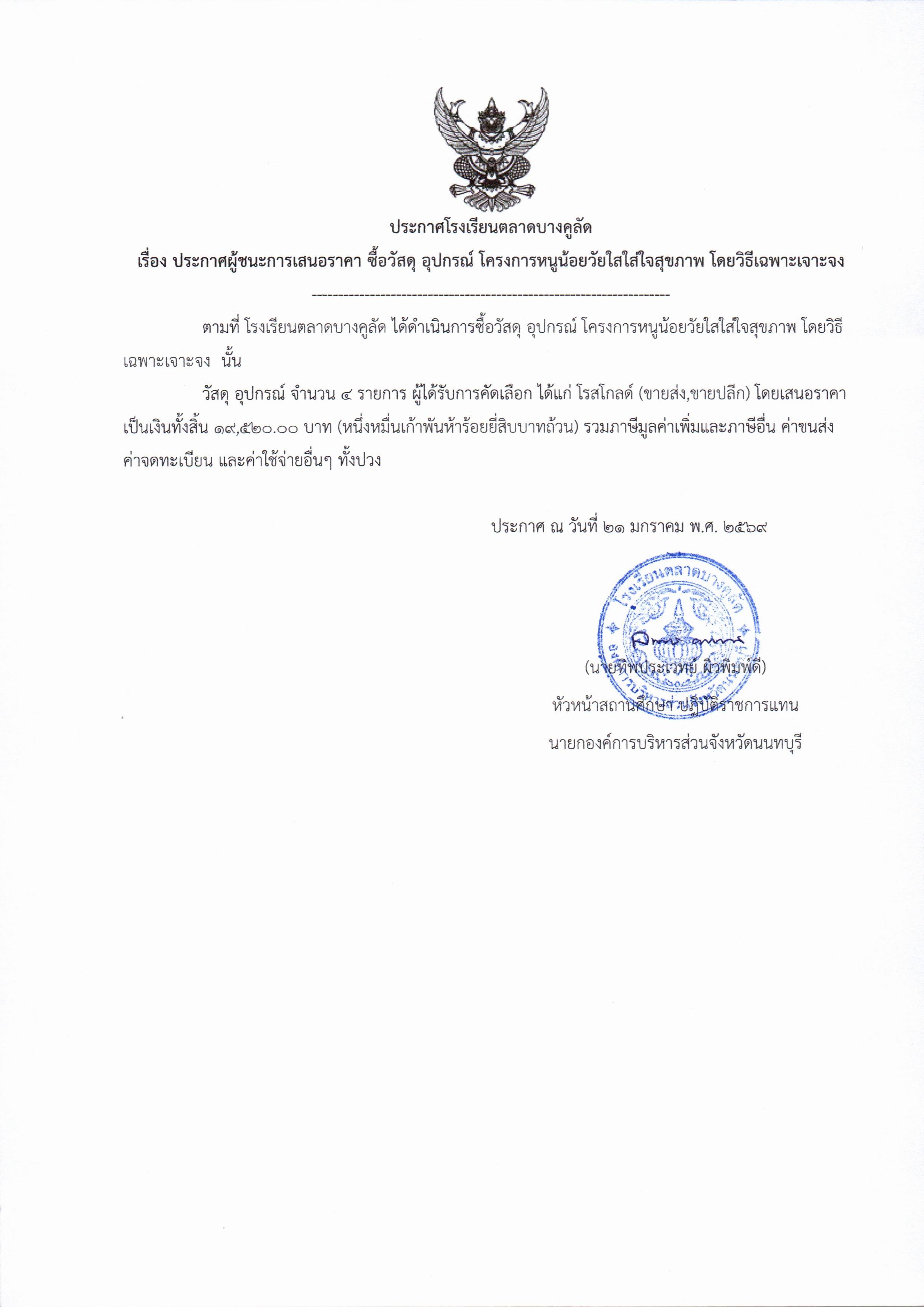 โรงเรียนตลาดบางคูลัด เรื่อง ประกาศผู้ชนะการเสนอราคา ซื้อวัสดุ อุปกรณ์ โครงการหนูน้อยวัยใสใส่ใจสุขภาพ ประจำปีงบประมาณ 2569 (ฏีกา 36/2569)