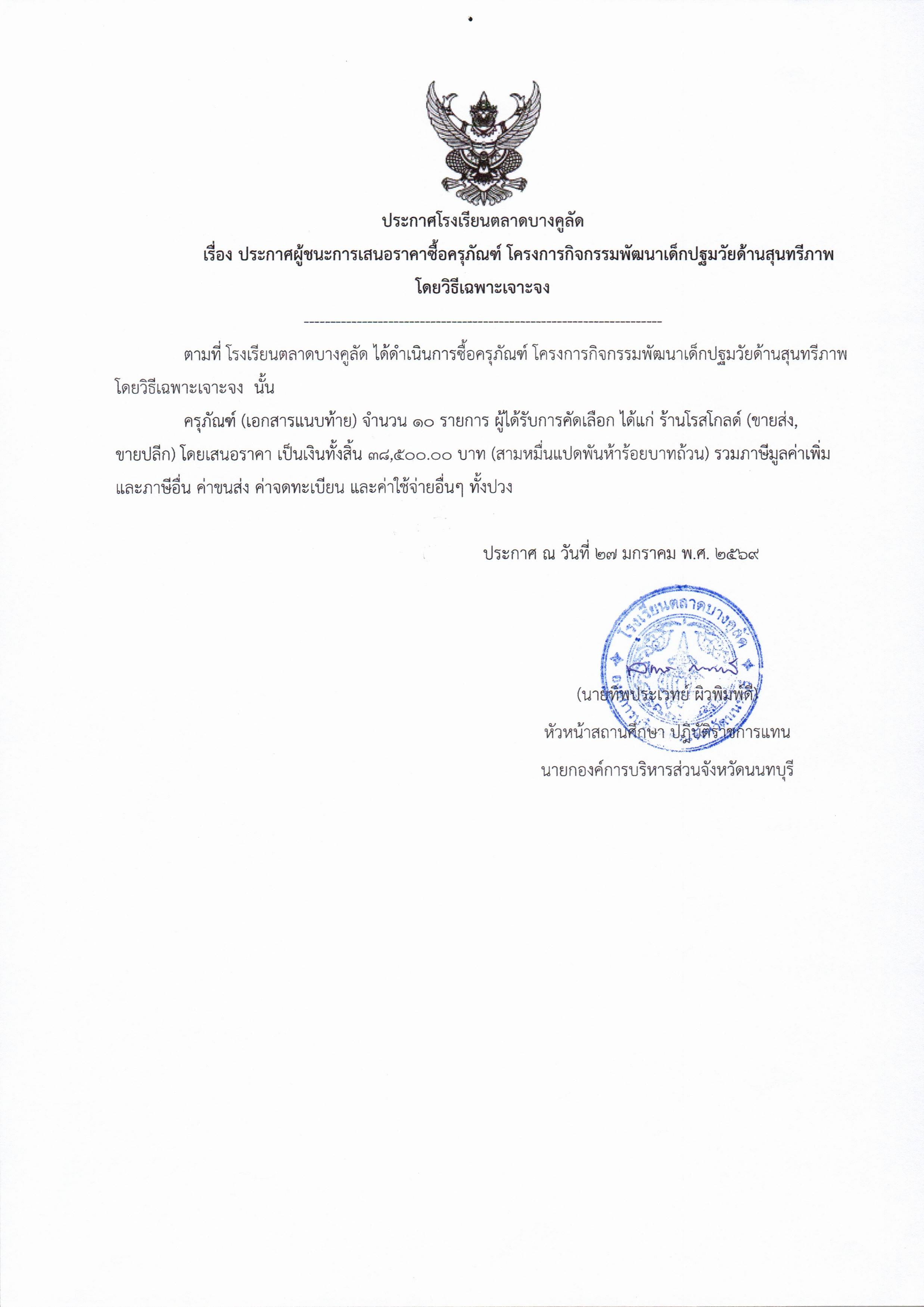 โรงเรียนตลาดบางคูลัด เรื่อง ประกาศผู้ชนะการเสนอราคา ซื้อวัสดุ อุปกรณ์ โครงการจัดกิจพัฒนาเด็กปฐมวัยด้านสุนทรียภาพ ประจำปีงบประมาณ 2569 (ฏีกา 39/2569)