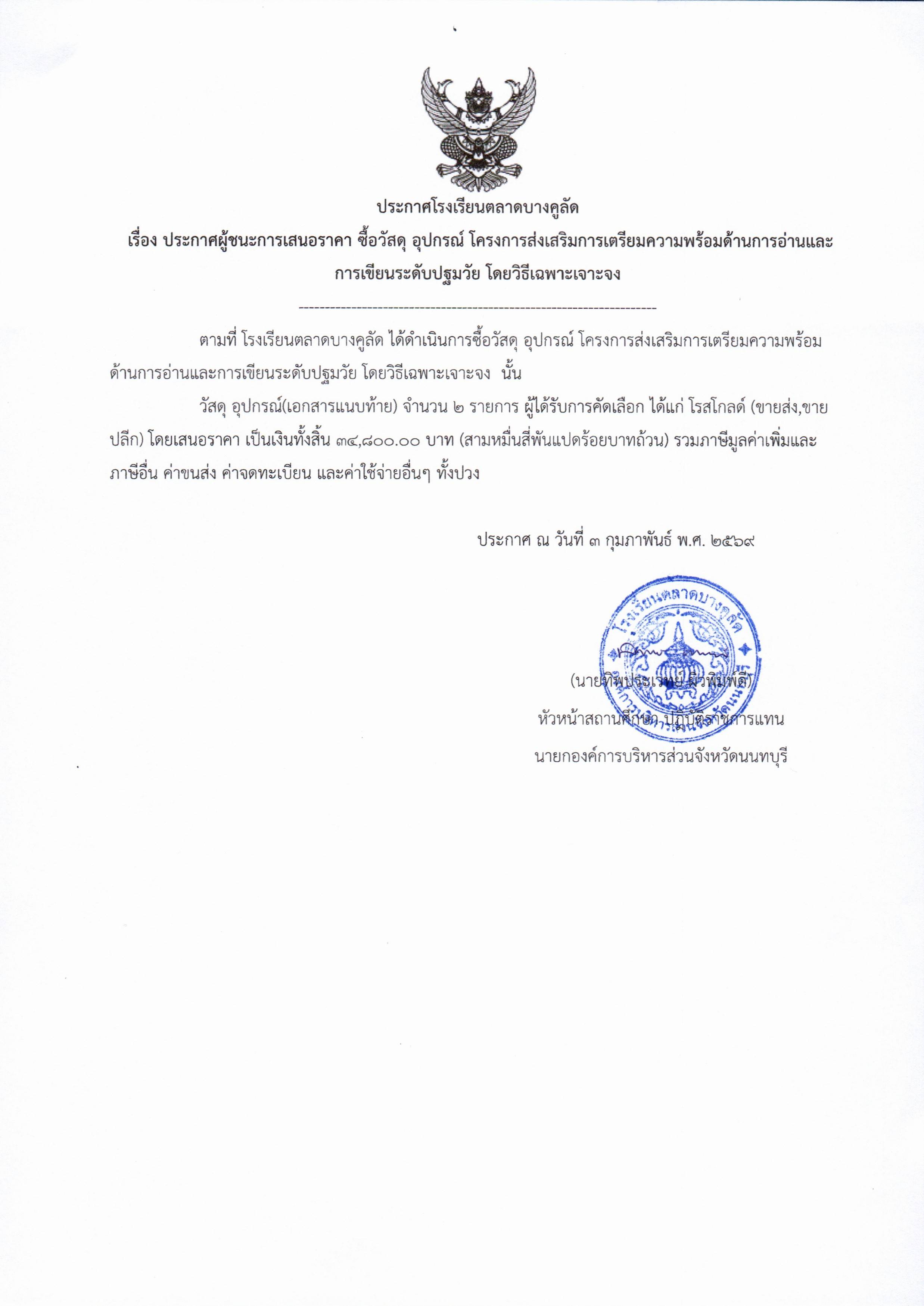 โรงเรียนตลาดบางคูลัด เรื่อง ประกาศผู้ชนะการเสนอราคา ซื้อวัสดุ อุปกรณ์ โครงการส่งเสริมการเตรียมความพร้อมด้านการอ่านและการเขียนระดับปฐมวัย ประจำปีงบประมาณ 2569 (ฏีกา 44/2569) |