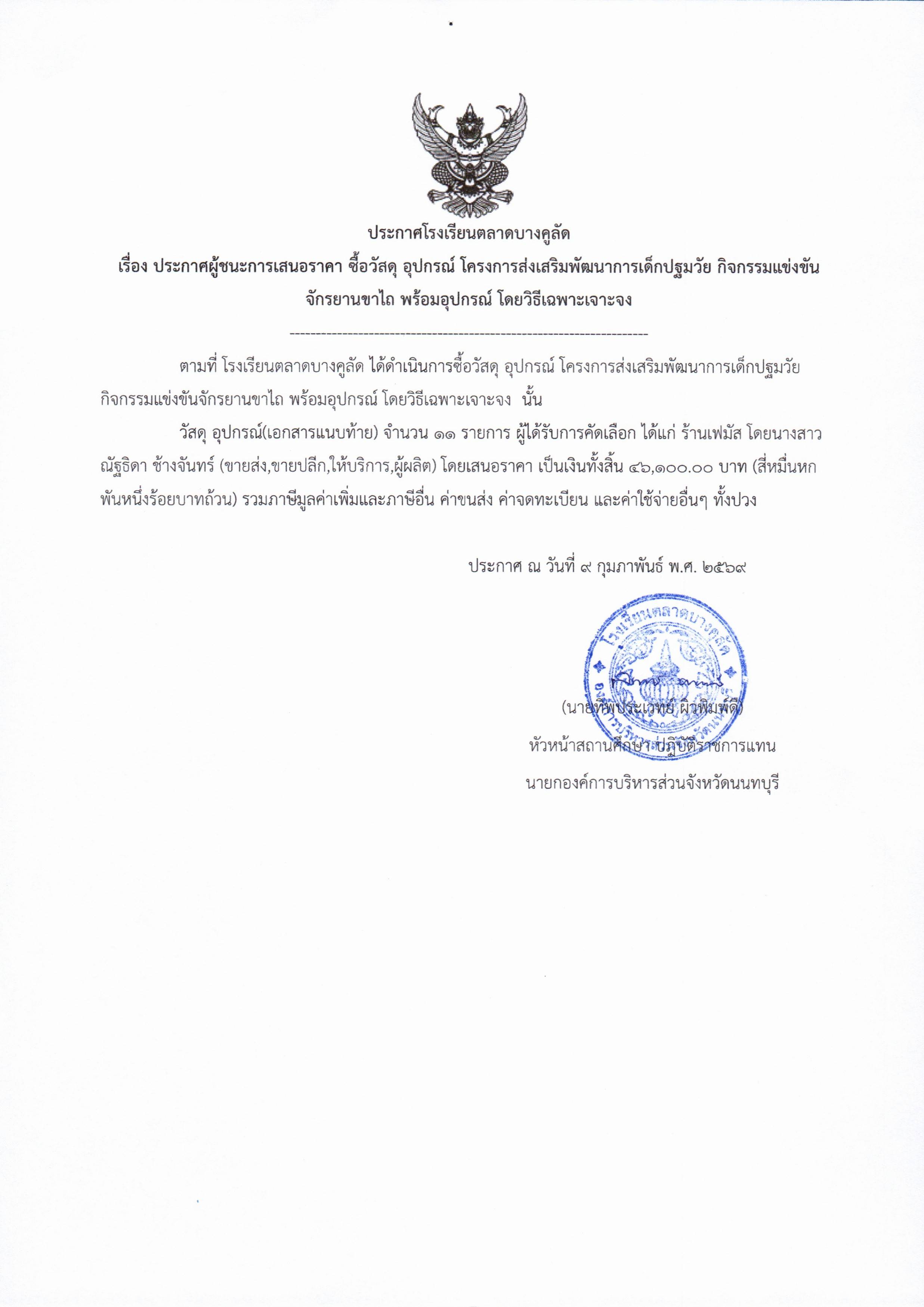 โรงเรียนตลาดบางคูลัด เรื่อง ประกาศผู้ชนะการเสนอราคา ซื้อวัสดุ อุปกรณ์ โครงการส่งเสริมพัฒนาการเด็กปฐมวัย กิจกรรมจักรยานขาไถ พร้อมอุปกรณ์ ประจำปีงบประมาณ 2569 (ฏีกา 45/2569)