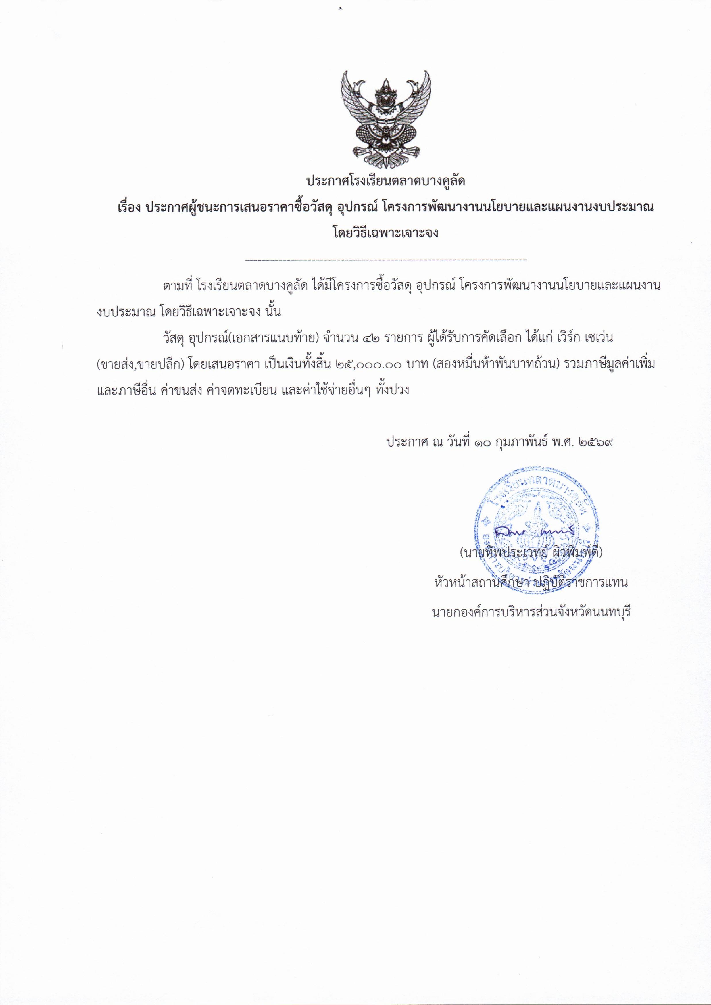 โรงเรียนตลาดบางคูลัด เรื่อง ประกาศผู้ชนะการเสนอราคา ซื้อวัสดุ อุปกรณ์ โครงการพัฒนางานนโยบายและแผนงานงบประมาณ ประจำปีงบประมาณ 2569 (ฏีกา 51/2569)