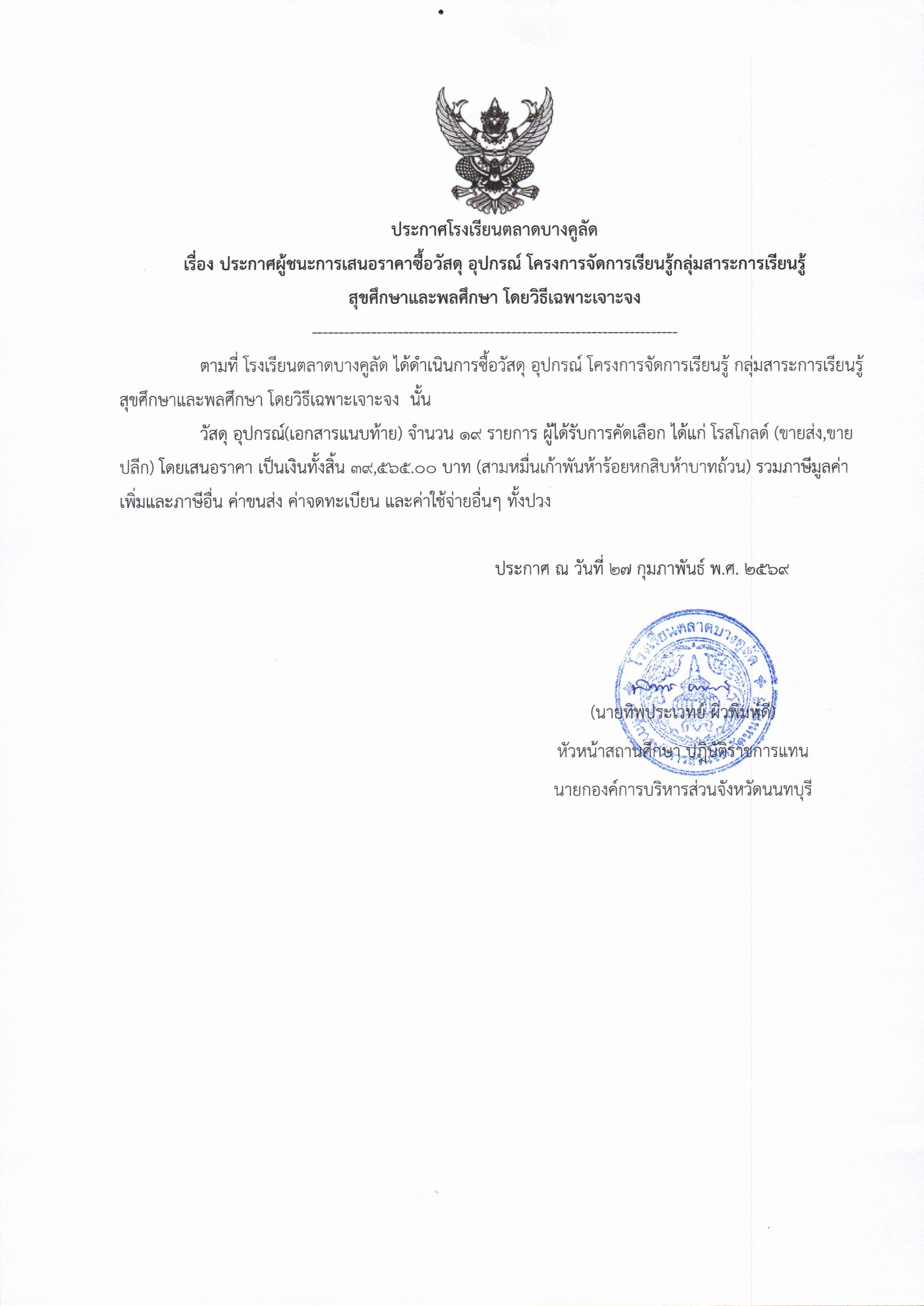 โรงเรียนตลาดบางคูลัด เรื่อง ประกาศผู้ชนะการเสนอราคา ซื้อวัสดุ อุปกรณ์ โครงการจัดการเรียนรู้ กลุ่มสาระการเรียนรู้สุขศึกษาและพลศึกษา ประจำปีงบประมาณ 2569 (ฏีกา 55/2569)