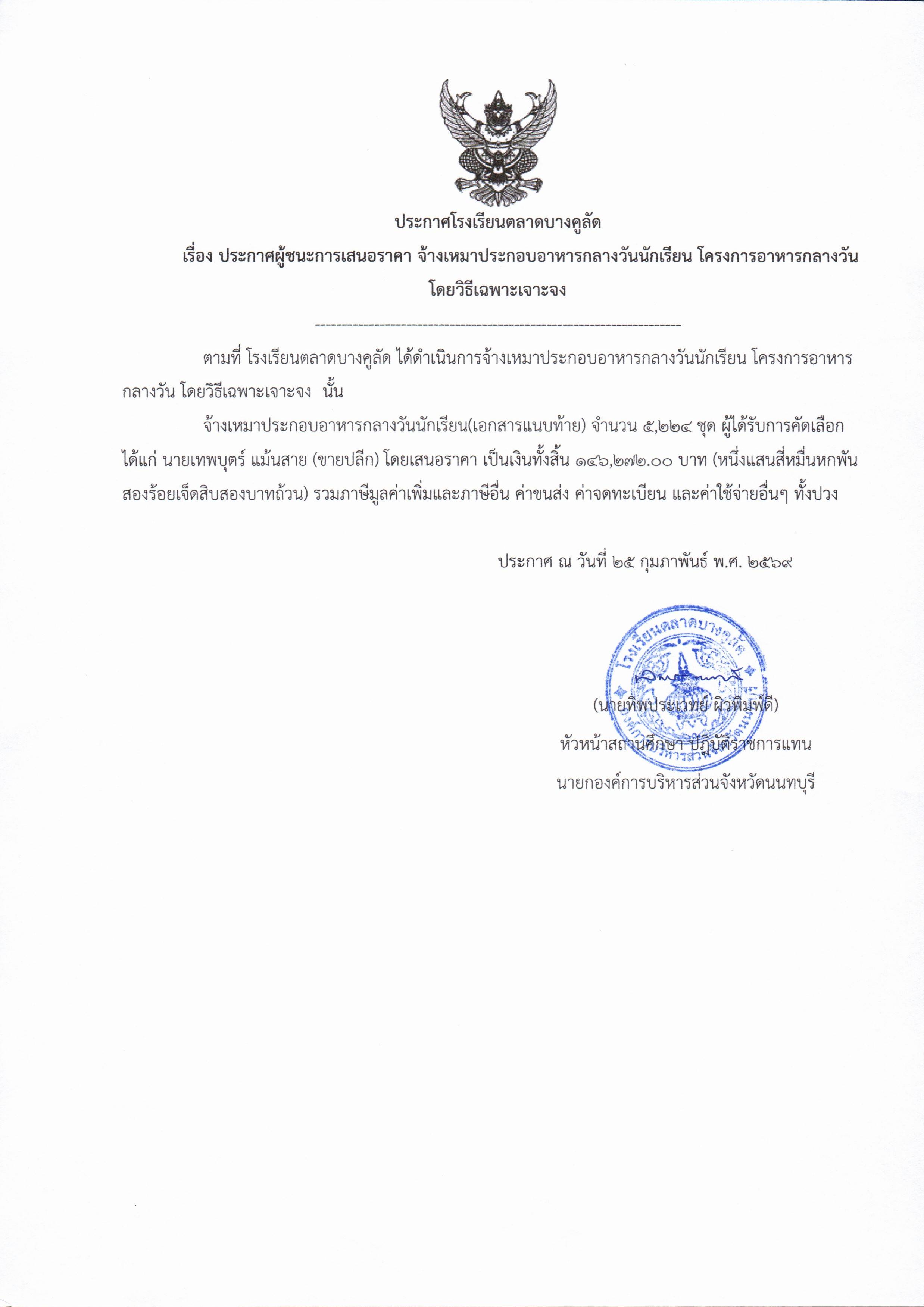 โรงเรียนตลาดบางคูลัด เรื่อง ประกาศผู้ชนะการเสนอราคา การจ้างเหมาบริการจัดทำอาหารกลางวัน (โครงการอาหารกลางวันนักเรียน) ประจำปีงบประมาณ 2569 (ฏีกา 58/2569)