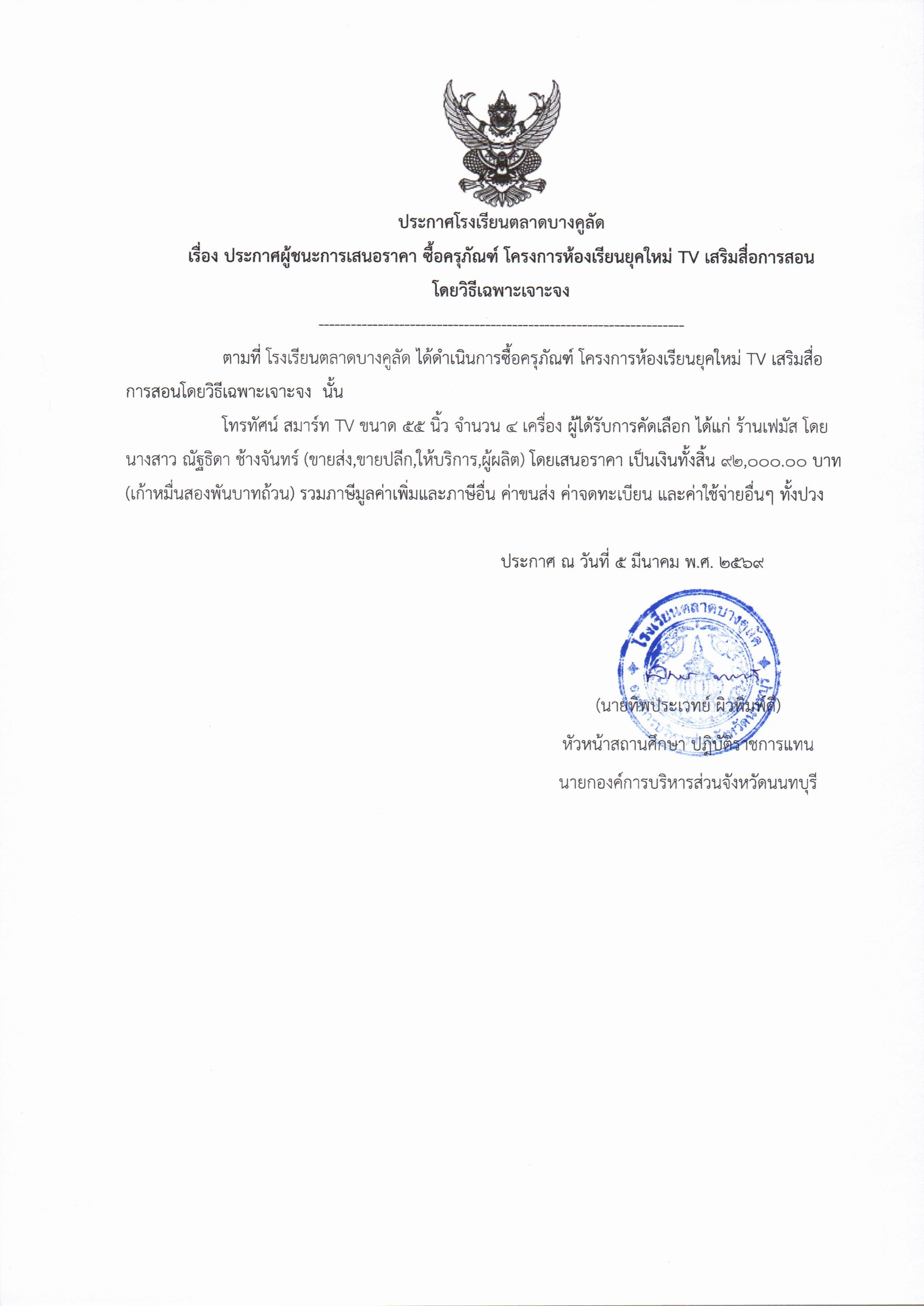 โรงเรียนตลาดบางคูลัด เรื่อง ประกาศผู้ชนะการเสนอราคา ซื้อครุภัณฑ์ โครงการห้องเรียนยุคใหม่ TV เสริมสื่อการสอน ประจำปีงบประมาณ 2569 (ฏีกา 59/2569) (ครุภัณฑ์)