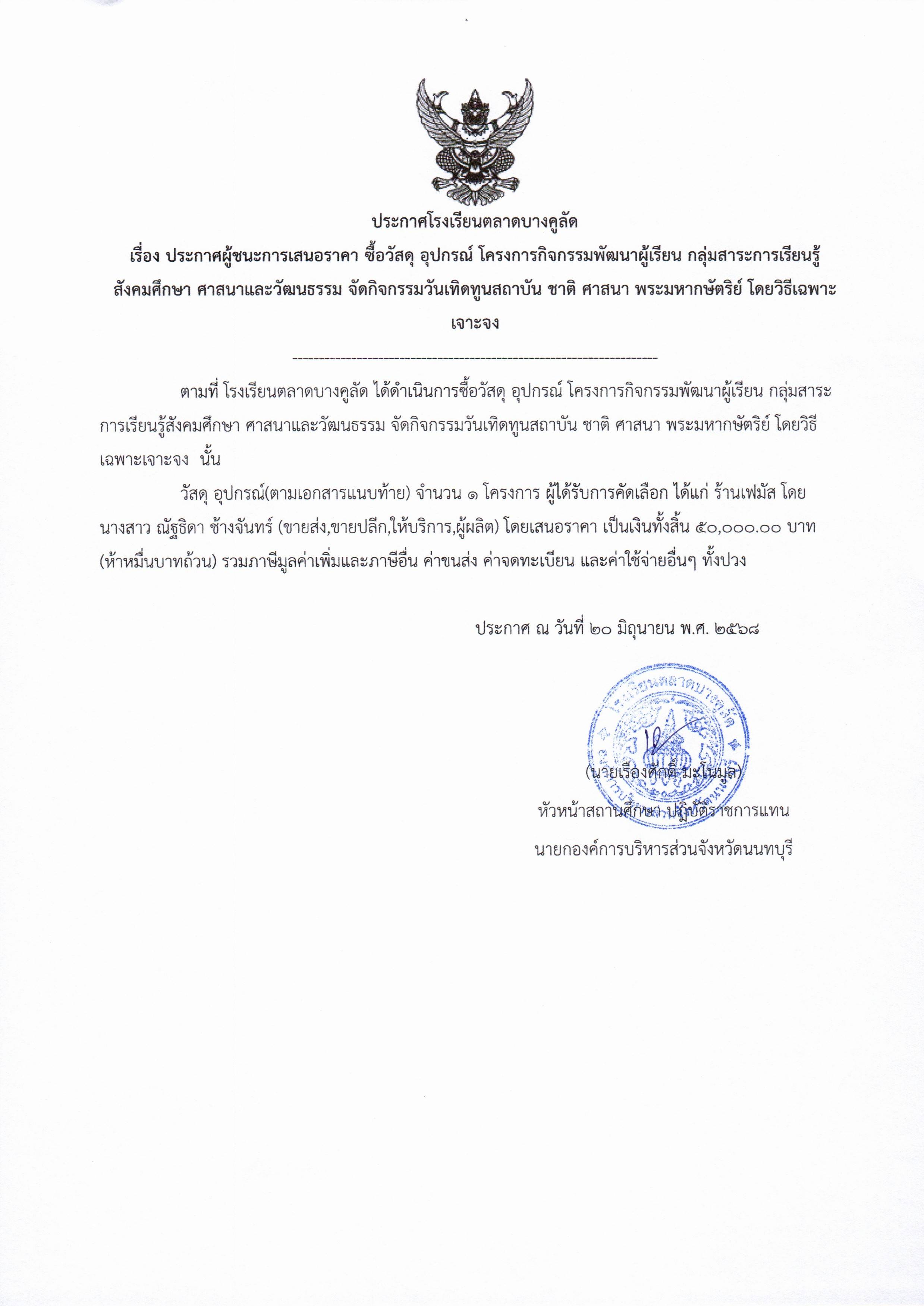 ประกาศจัดซื้อจัดจ้าง โรงเรียนตลาดบางคูลัด เรื่อง ประกาศผู้ชนะการเสนอราคา จัดซื้อวัสดุอุปกรณ์ (โครงการกิจกรรมพัฒนาผู้เรียน กลุ่มสาระการเรียนรู้สังคมศึกษา ศาสนาและวัฒนธรรม จัดกิจกรรมวันเทิดทูนชาติ ศาสนา พระมหากษัตริย์ ประจำปีงบประมาณ 2568 (ฏีกา 84/2568)