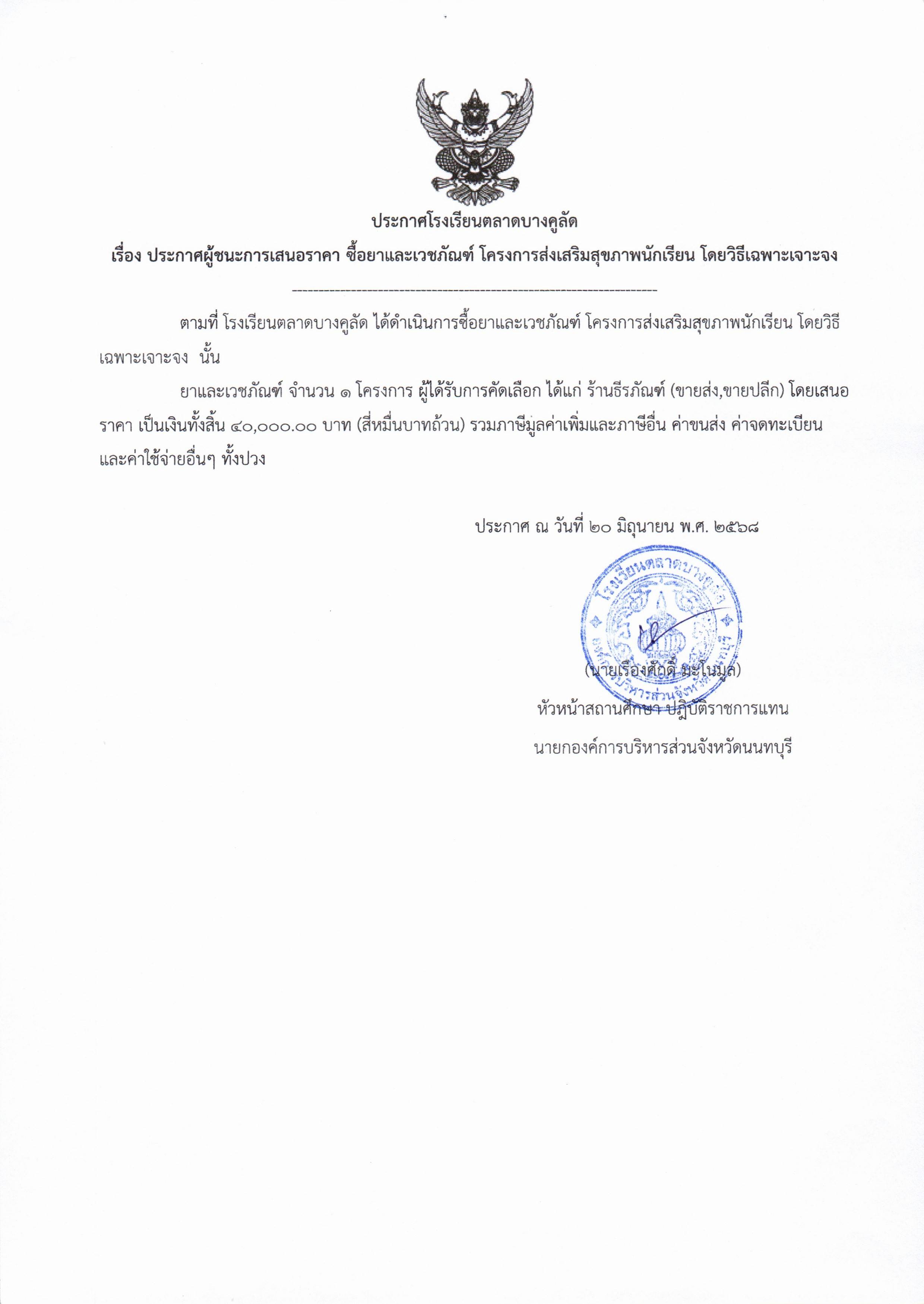ประกาศจัดซื้อจัดจ้าง โรงเรียนตลาดบางคูลัด เรื่อง ประกาศผู้ชนะการเสนอราคา การจ้างเหมาบริการจัดทำอาหารกลางวัน (โครงการอาหารกลางวันนักเรียน) ประจำปีงบประมาณ 2568 (ฏีกา 85/2568)