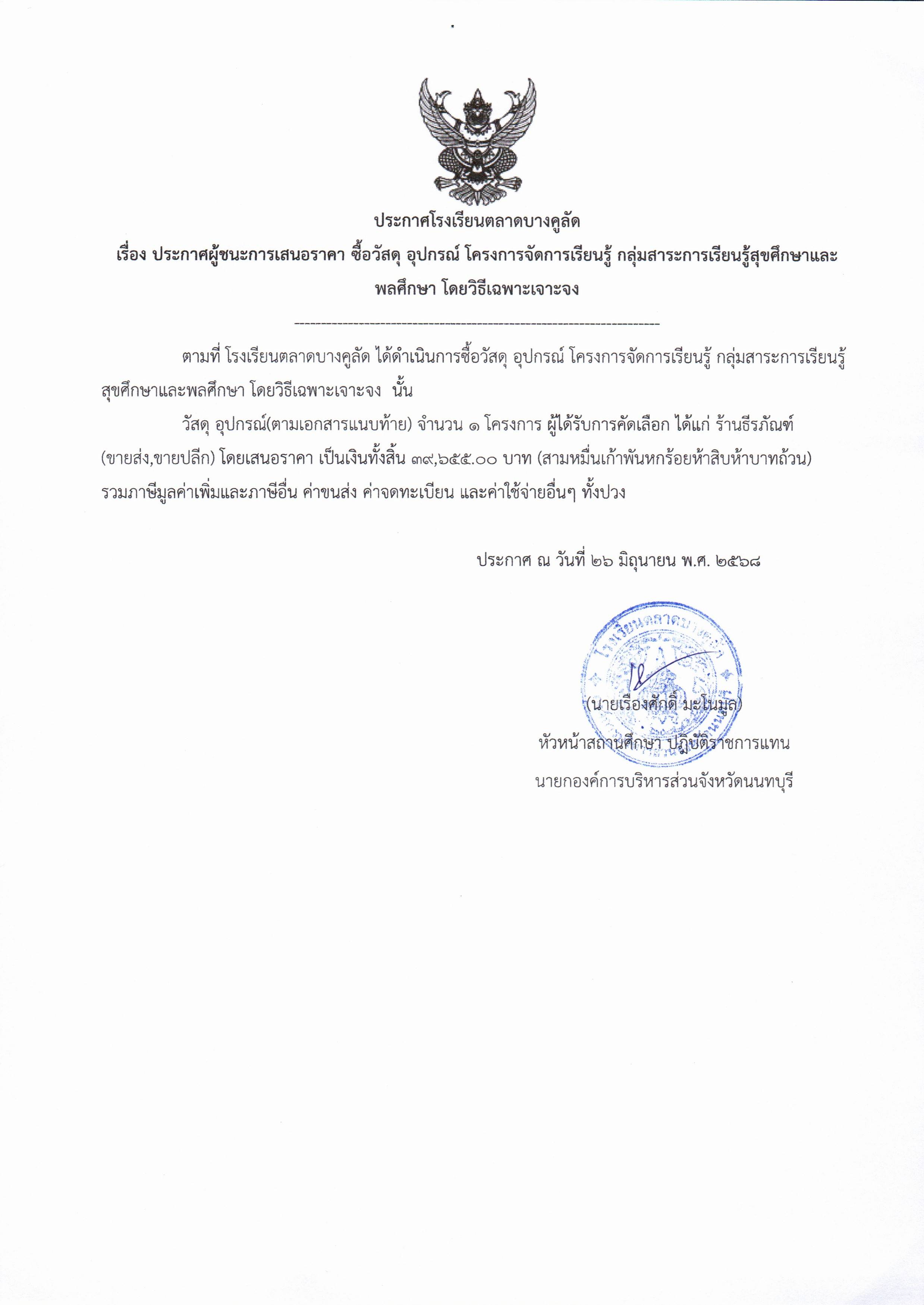 ประกาศจัดซื้อจัดจ้าง โรงเรียนตลาดบางคูลัด เรื่อง ประกาศผู้ชนะการเสนอราคา จัดซื้อวัสดุอุปกรณ์ (โครงการจัดการเรียนรู้ กลุ่มสาระการเรียนรู้สุขศึกษาและพลศึกษา ) ประจำปีงบประมาณ 2568 (ฏีกา 86/2568)