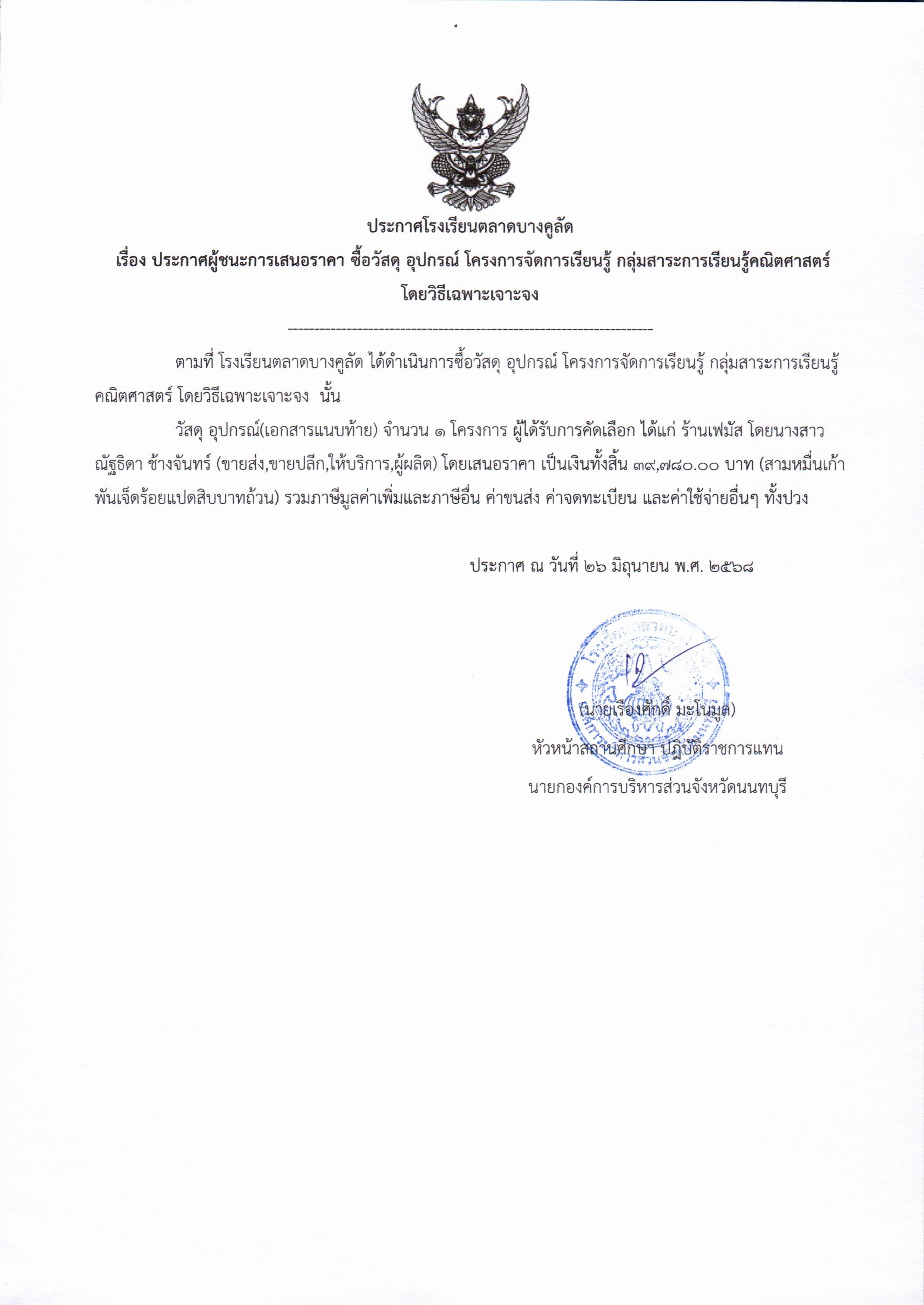 ประกาศจัดซื้อจัดจ้าง โรงเรียนตลาดบางคูลัด เรื่อง ประกาศผู้ชนะการเสนอราคา จัดซื้อวัสดุอุปกรณ์ (โครงการจัดการเรียนรู้ กลุ่มสาระการเรียนรู้คณิตศาสตร์) ประจำปีงบประมาณ 2568 (ฏีกา 88/2568)