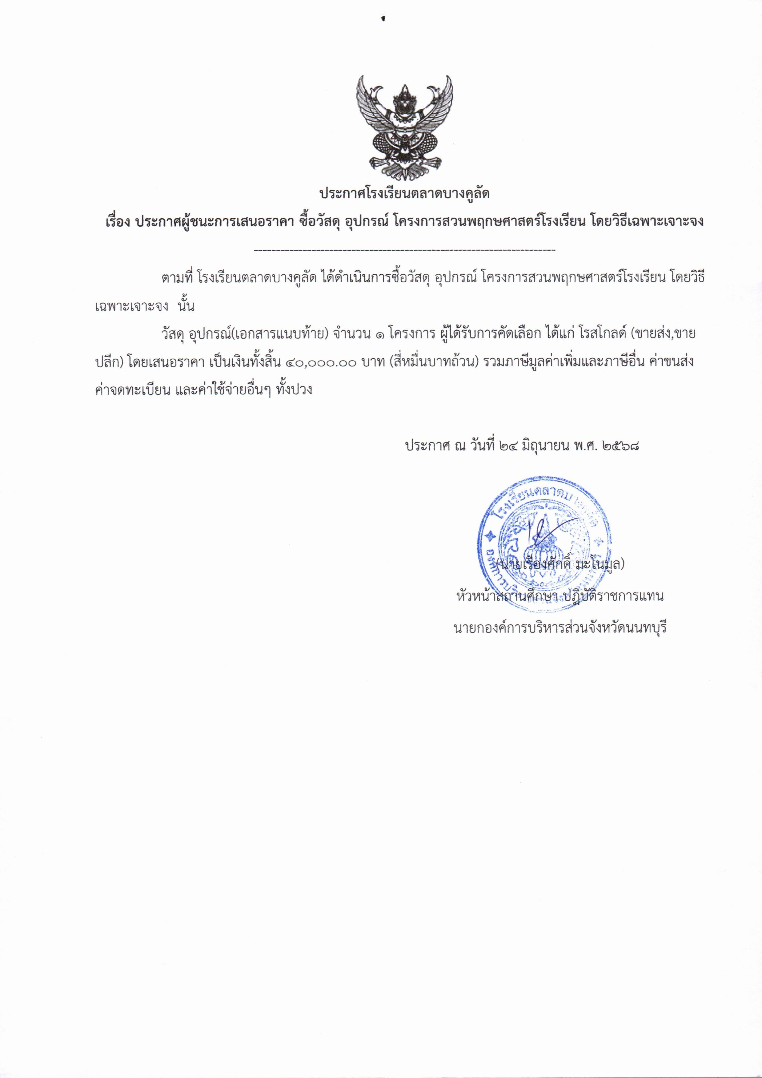 ประกาศจัดซื้อจัดจ้าง โรงเรียนตลาดบางคูลัด เรื่อง ประกาศผู้ชนะการเสนอราคา จัดซื้อวัสดุอุปกรณ์ (โครงการสวนพฤกษศาสตร์) ประจำปีงบประมาณ 2568 (ฏีกา 91/2568)
