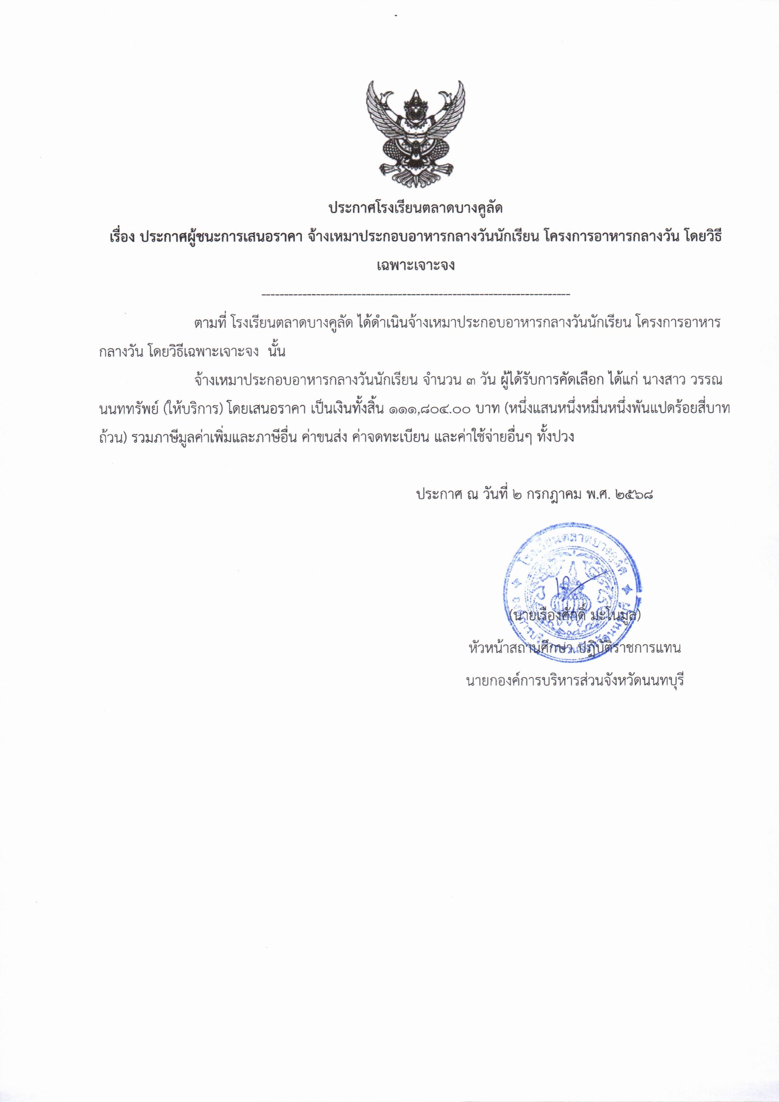 ประกาศจัดซื้อจัดจ้าง โรงเรียนตลาดบางคูลัด เรื่อง ประกาศผู้ชนะการเสนอราคา การจ้างเหมาบริการจัดทำอาหารกลางวัน (โครงการอาหารกลางวันนักเรียน) ประจำปีงบประมาณ 2568 (ฏีกา 96/2568)