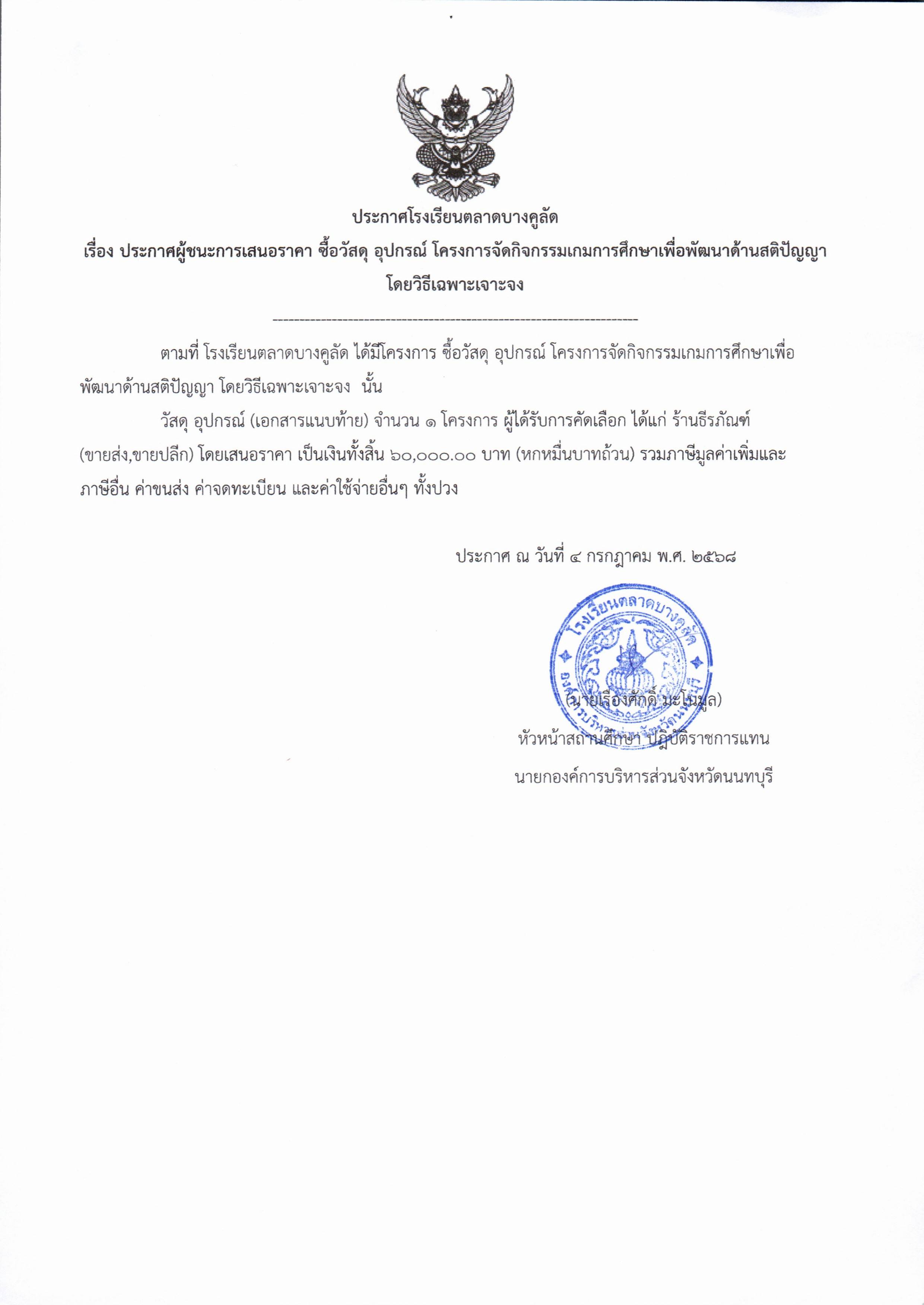 ประกาศจัดซื้อจัดจ้าง โรงเรียนตลาดบางคูลัด เรื่อง ประกาศผู้ชนะการเสนอราคา จัดซื้อวัสดุอุปกรณ์ (โครงการกิจกรรมเกมการศึกษาเพื่อพัฒนาด้านสติปัญญา) ประจำปีงบประมาณ 2568 (ฏีกา 98/2568)