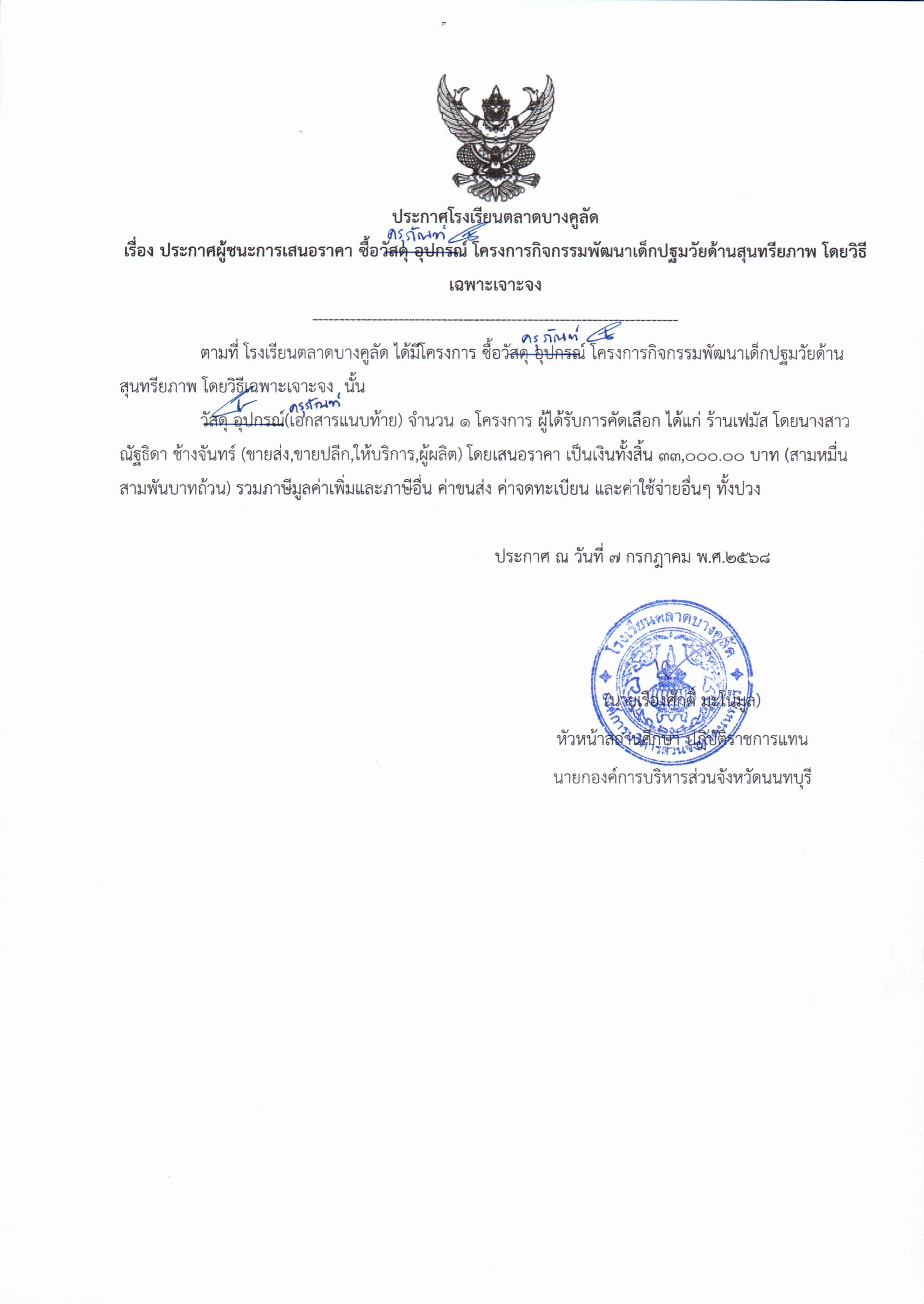 ประกาศจัดซื้อจัดจ้าง โรงเรียนตลาดบางคูลัด เรื่อง ประกาศผู้ชนะการเสนอราคา จัดซื้อครุภัณฑ์ (โครงการกิจกรรมพัฒนาเด็กปฐมวัย ด้านสุนทรียภาพ) ประจำปีงบประมาณ 2568 (ฏีกา 99/2568)