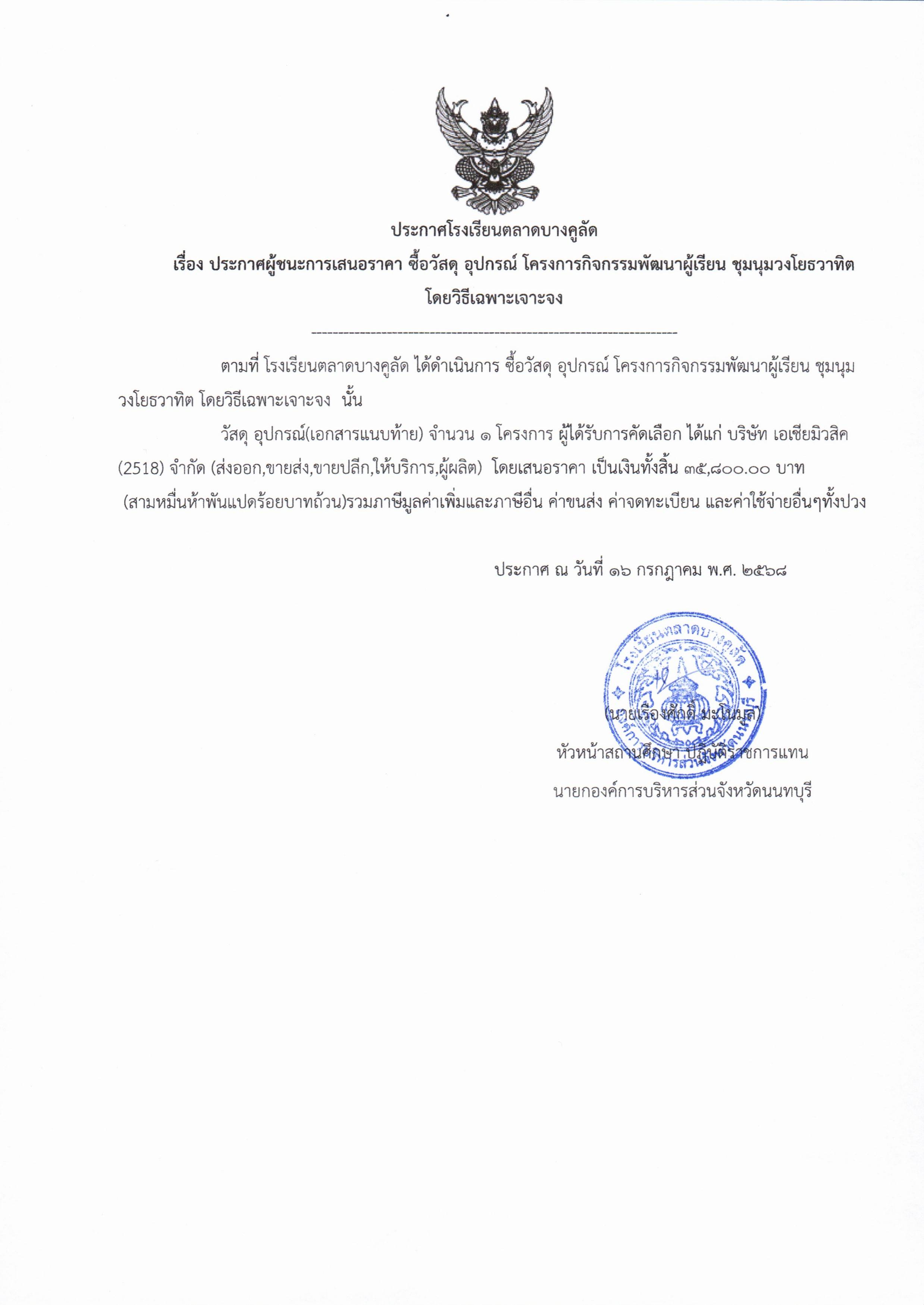 ประกาศจัดซื้อจัดจ้าง โรงเรียนตลาดบางคูลัด เรื่อง ประกาศผู้ชนะการเสนอราคา จัดซื้อวัสดุอุแกรณ์ (โครงการกิจกรรมพัฒนาผู้เรียน ชุมนุมวงโยธวาทิต) ประจำปีงบประมาณ 2568 (ฏีกา 101/2568)