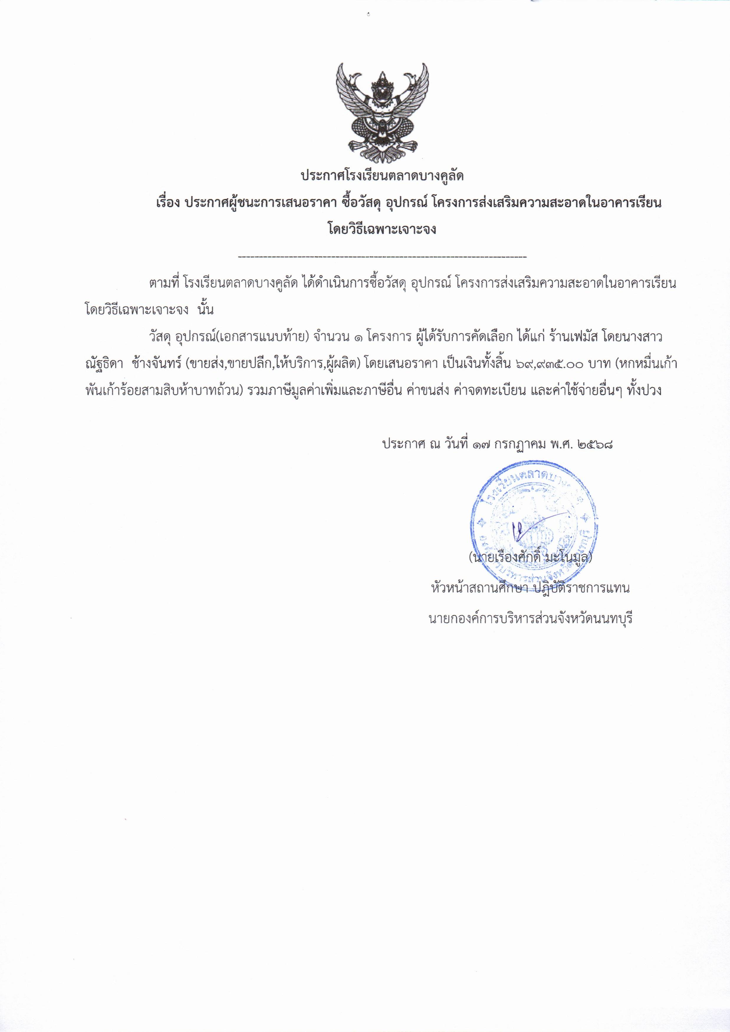 ประกาศจัดซื้อจัดจ้าง โรงเรียนตลาดบางคูลัด เรื่อง ประกาศผู้ชนะการเสนอราคา จัดซื้อวัสดุอุแกรณ์ (โครงการส่งเสริมความสะอาดในอาคารเรียน) ประจำปีงบประมาณ 2568 (ฏีกา 102/2568)