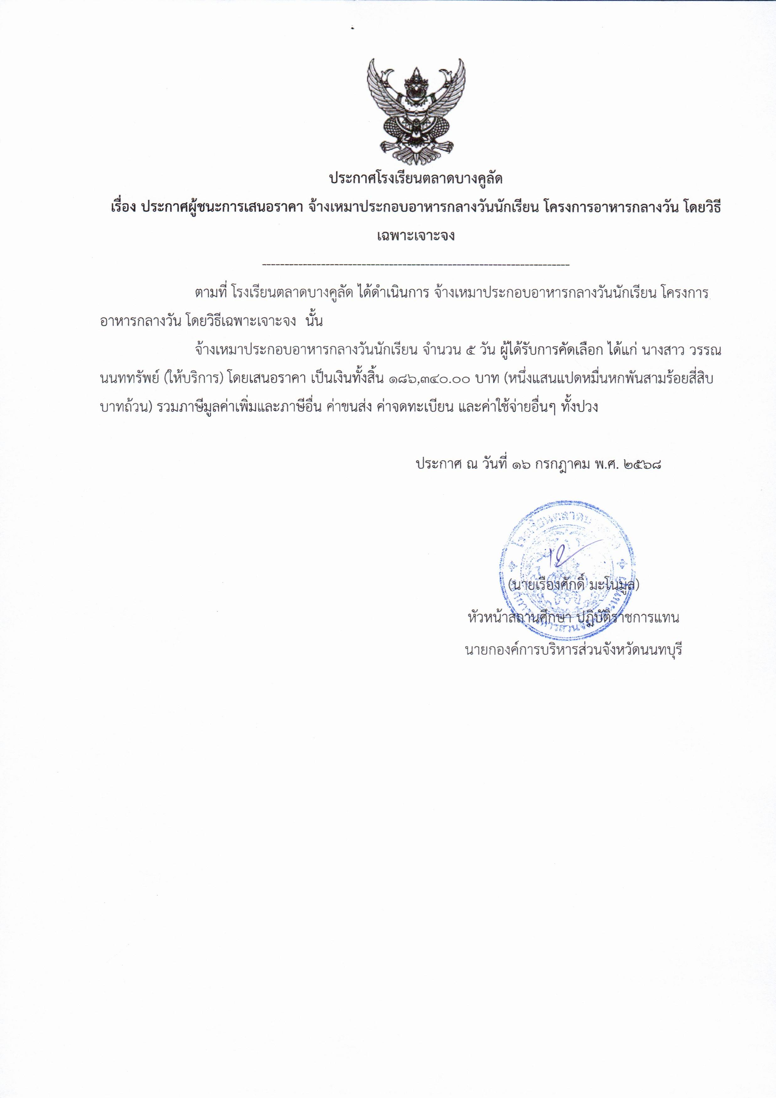 ประกาศจัดซื้อจัดจ้าง โรงเรียนตลาดบางคูลัด เรื่อง ประกาศผู้ชนะการเสนอราคา การจ้างเหมาบริการจัดทำอาหารกลางวัน (โครงการอาหารกลางวันนักเรียน) ประจำปีงบประมาณ 2568 (ฏีกา 104/2568)