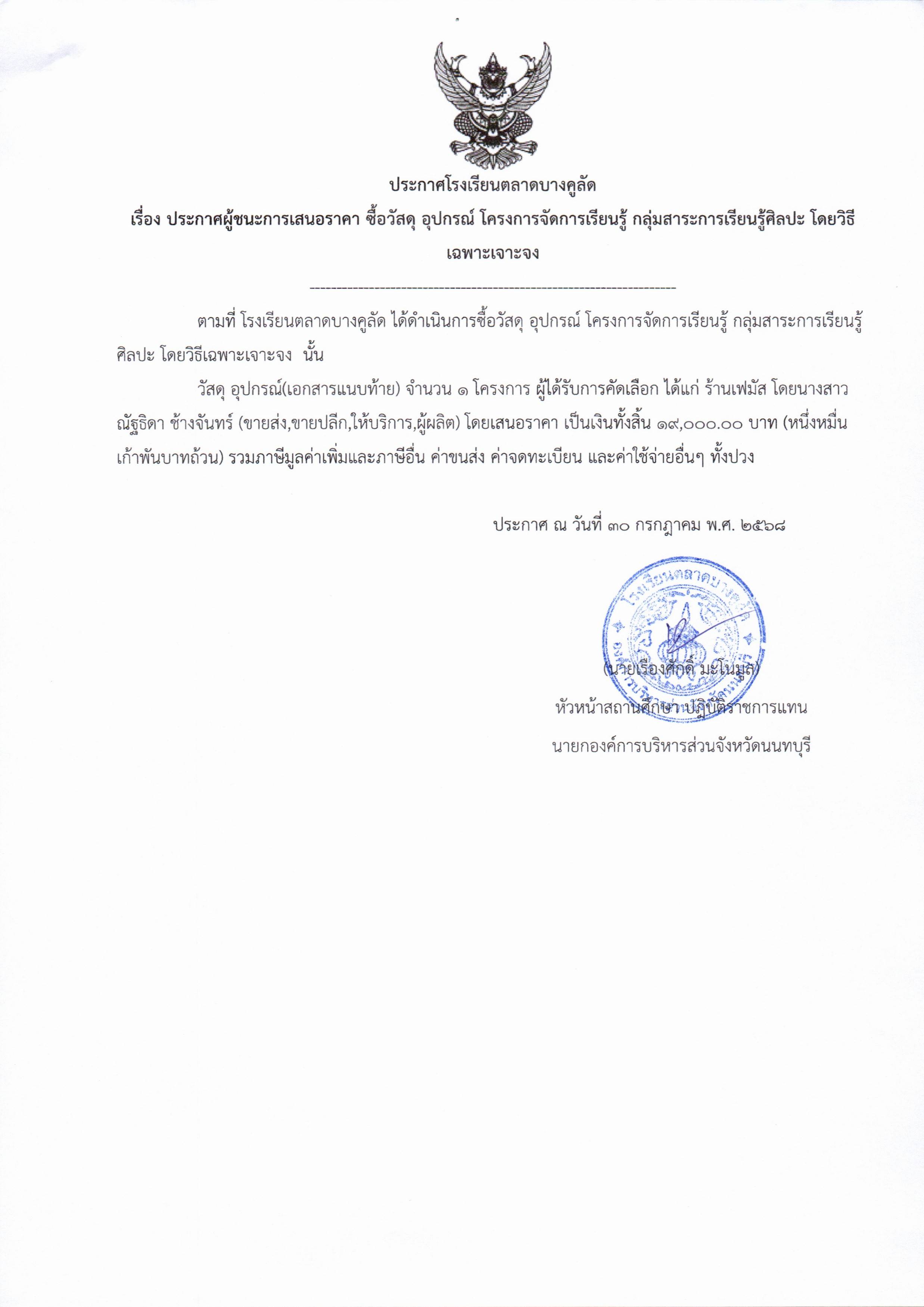 ประกาศจัดซื้อจัดจ้าง โรงเรียนตลาดบางคูลัด เรื่อง ประกาศผู้ชนะการเสนอราคา จัดซื้อวัสดุอุปกรณ์ (โครงการจัดการเรียนรู้ กลุ่มสาระการเรียนรู้ศิลปะ) ประจำปีงบประมาณ 2568 (ฏีกา 109/2568)