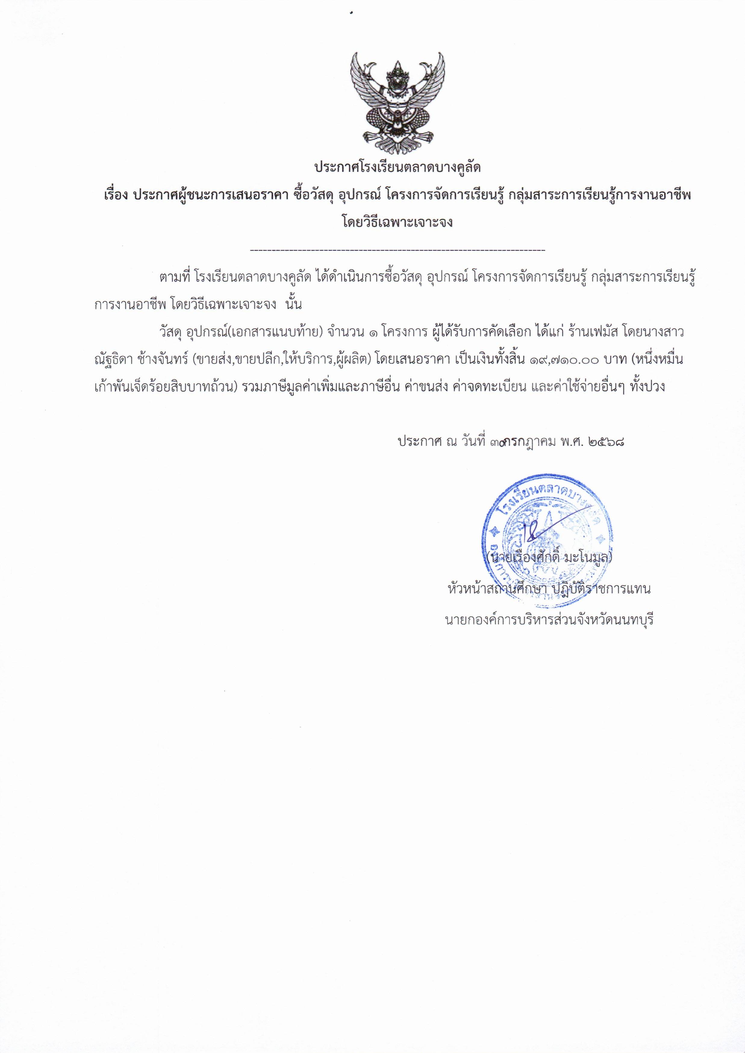 ประกาศจัดซื้อจัดจ้าง โรงเรียนตลาดบางคูลัด เรื่อง ประกาศผู้ชนะการเสนอราคา จัดซื้อวัสดุอุปกรณ์ (โครงการจัดการเรียนรู้ กลุ่มสาระการเรียนรู้การงานอาชีพ) ประจำปีงบประมาณ 2568 (ฏีกา 110/2568)