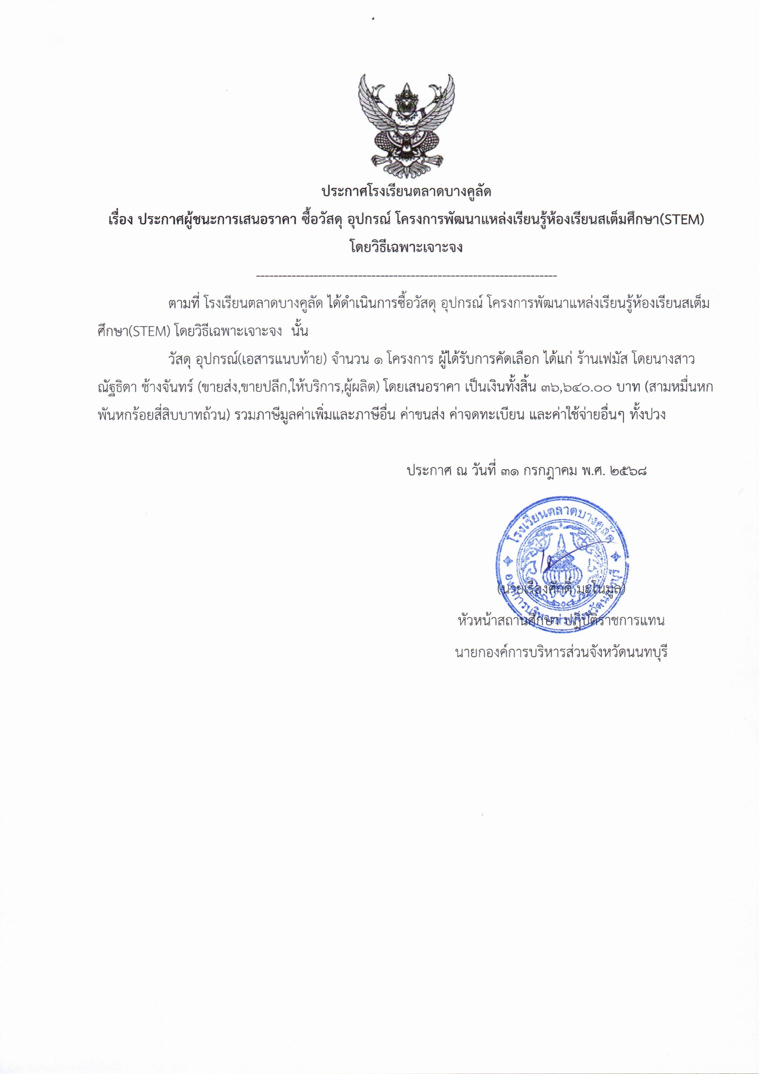 ประกาศจัดซื้อจัดจ้าง โรงเรียนตลาดบางคูลัด เรื่อง ประกาศผู้ชนะการเสนอราคา จัดซื้อวัสดุอุปกรณ์ (โครงการพัฒนาแหล่งเรียนรู้ห้องเรียนสเต็มศึกษา) ประจำปีงบประมาณ 2568 (ฏีกา 111/2568)