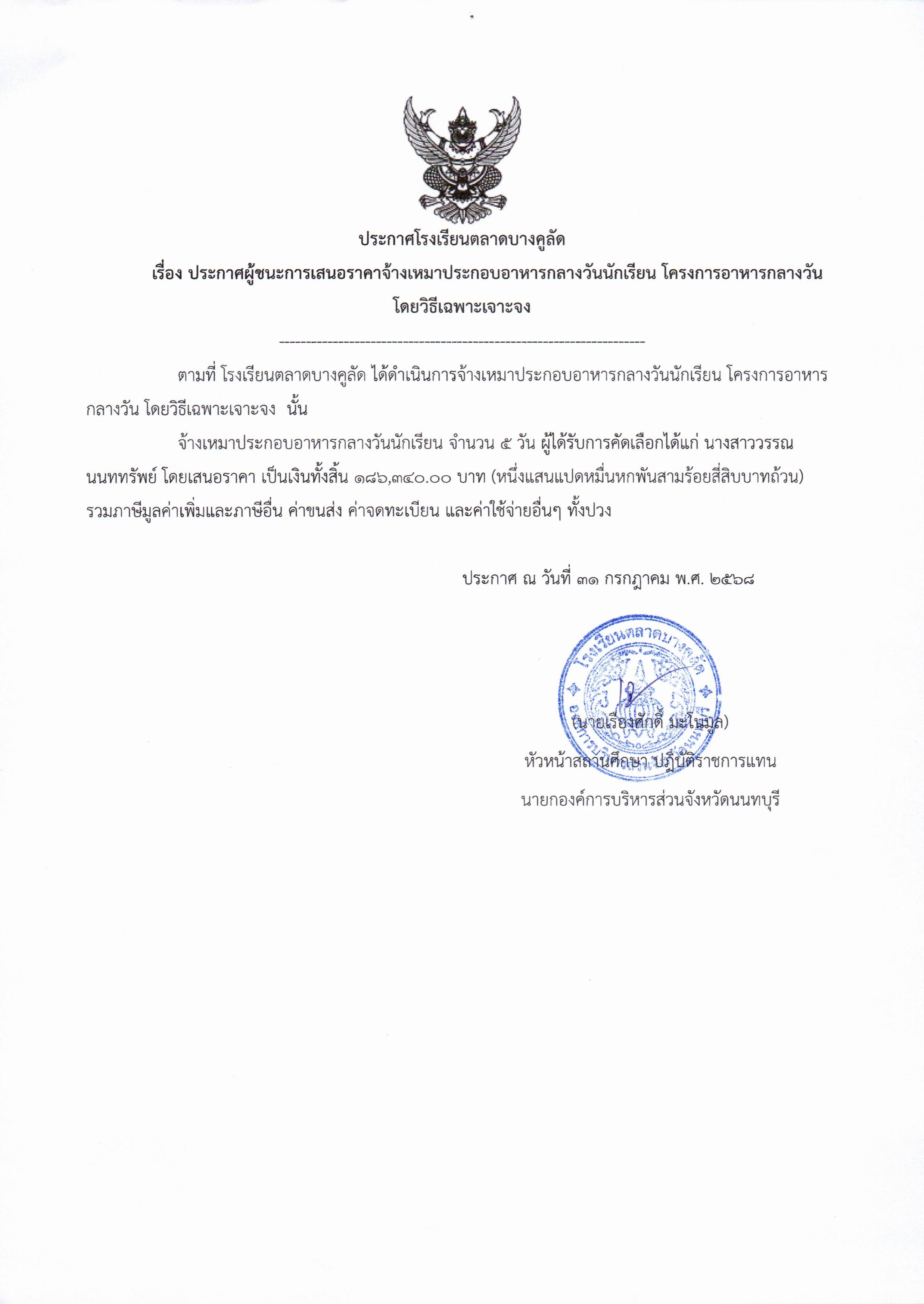 ประกาศจัดซื้อจัดจ้าง โรงเรียนตลาดบางคูลัด เรื่อง ประกาศผู้ชนะการเสนอราคา การจ้างเหมาบริการจัดทำอาหารกลางวัน (โครงการอาหารกลางวันนักเรียน) ประจำปีงบประมาณ 2568 (ฏีกา 112/2568)