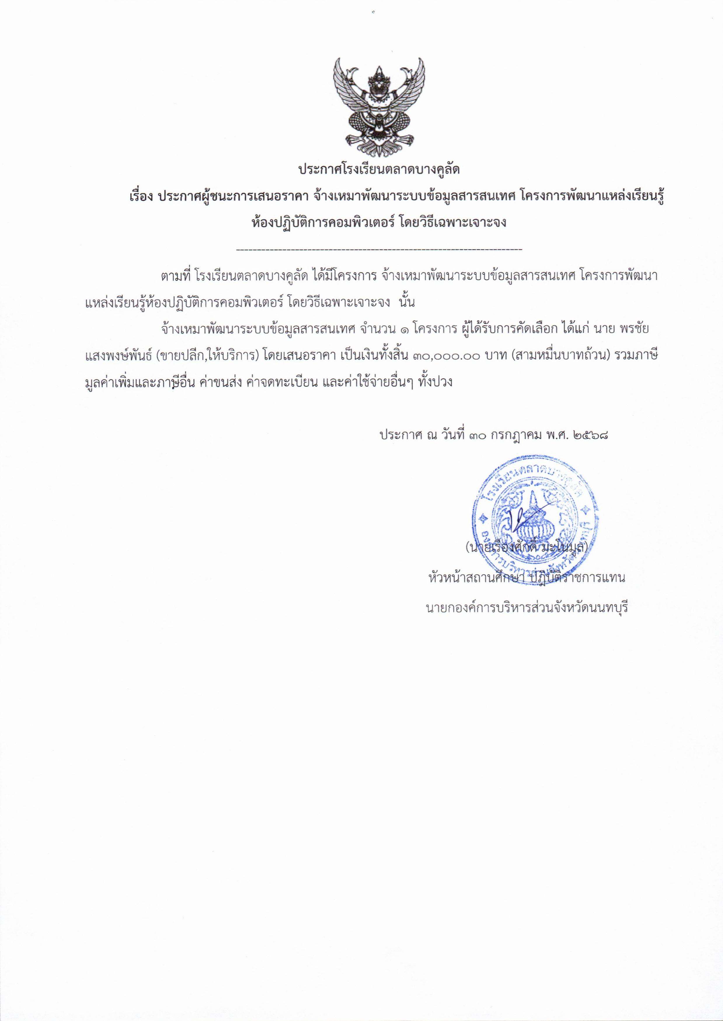 ประกาศจัดซื้อจัดจ้าง โรงเรียนตลาดบางคูลัด เรื่อง ประกาศผู้ชนะการเสนอราคา จ้างเหมาพัฒนาระบบข้อมูสารสนเทศ (โครงการพัฒนาแหล่งเรียนรู้ห้องเปฏิบัติการคอมพิวเตอร์) ประจำปีงบประมาณ 2568 (ฏีกา 113/2568)