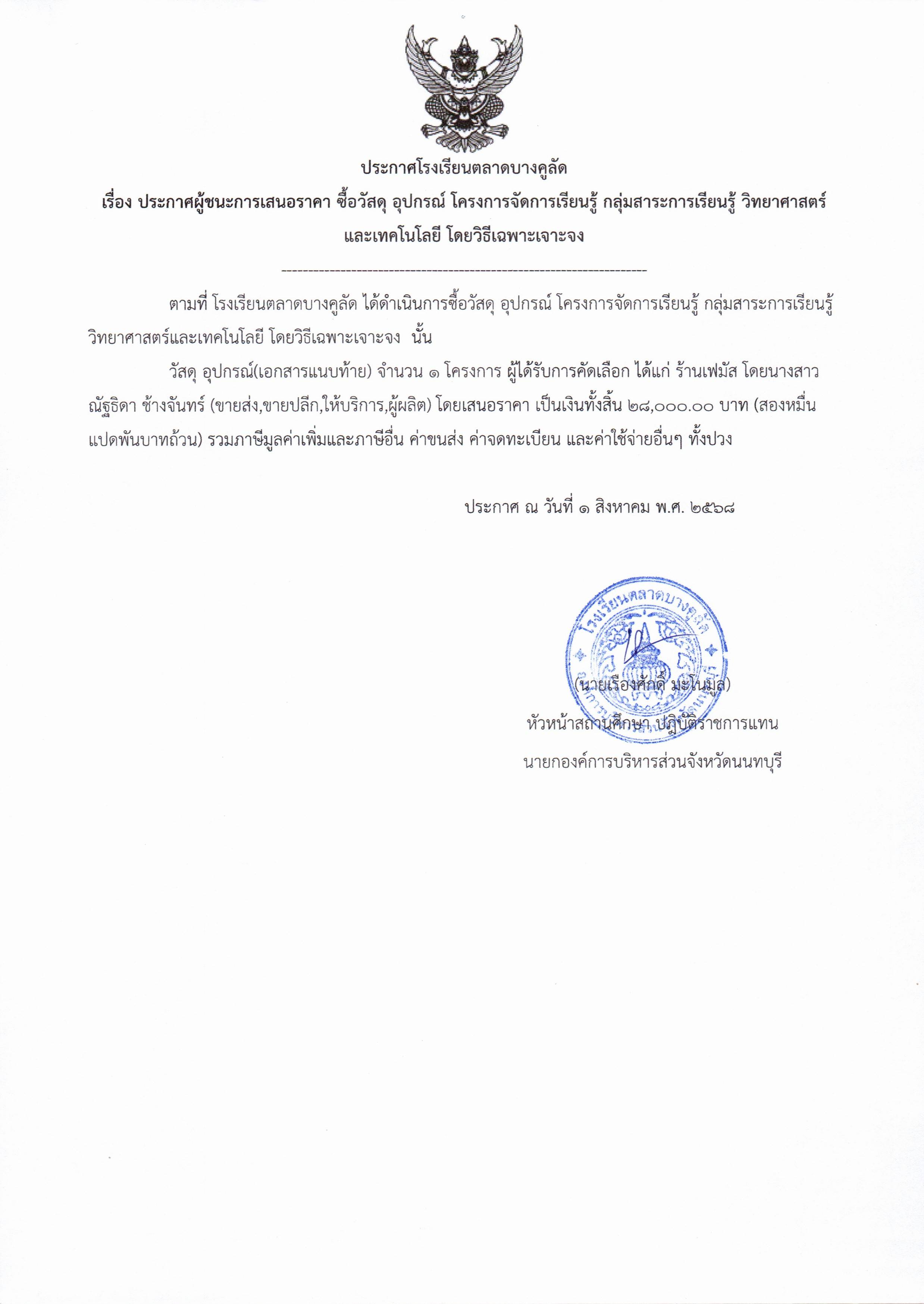 ประกาศจัดซื้อจัดจ้าง โรงเรียนตลาดบางคูลัด เรื่อง ประกาศผู้ชนะการเสนอราคา จัดซื้อวัสดุอุปกรณ์ (โครงการจัดการเรียนรู้ กลุ่มสาระการเรียนรู้วิทยาศาสตร์ ) ประจำปีงบประมาณ 2568 (ฏีกา 116/2568)