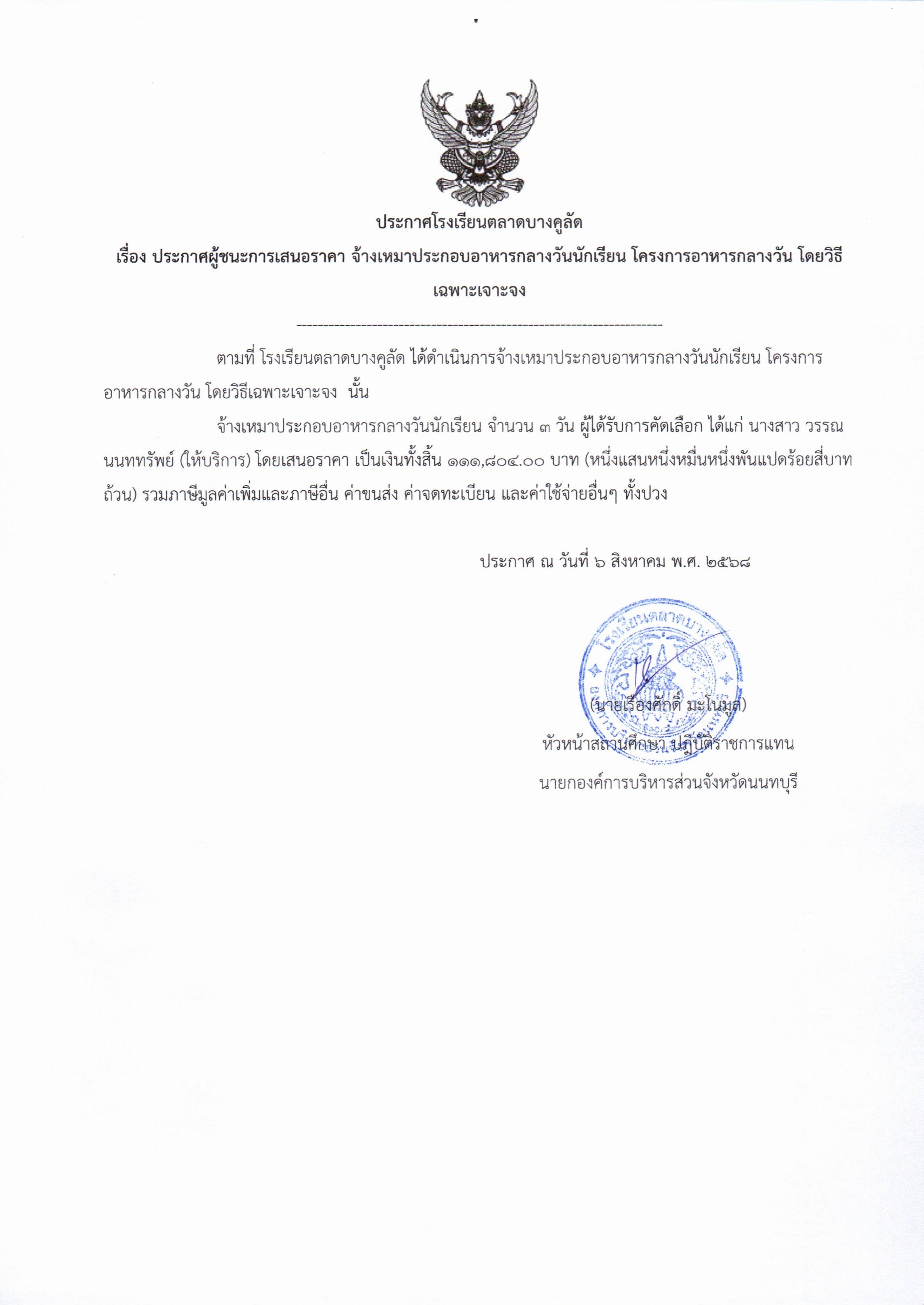 ประกาศจัดซื้อจัดจ้าง โรงเรียนตลาดบางคูลัด เรื่อง ประกาศผู้ชนะการเสนอราคา การจ้างเหมาบริการจัดทำอาหารกลางวัน (โครงการอาหารกลางวันนักเรียน) ประจำปีงบประมาณ 2568 (ฏีกา 117/2568)