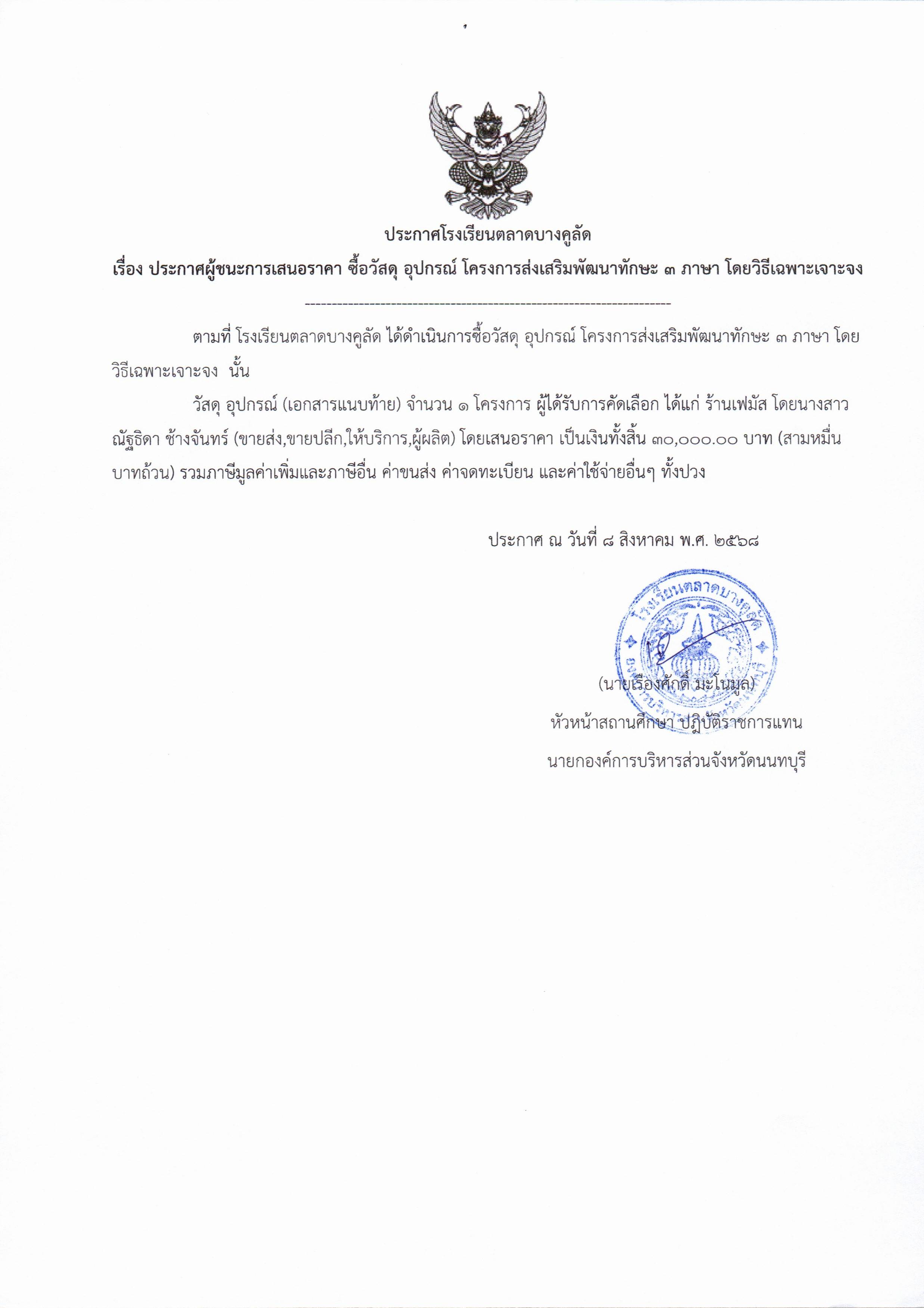 ประกาศจัดซื้อจัดจ้าง โรงเรียนตลาดบางคูลัด เรื่อง ประกาศผู้ชนะการเสนอราคา จัดซื้อวัสดุอุปกรณ์ (โครงการส่งเสริมทักษะ 3 ภาษา ) ประจำปีงบประมาณ 2568 (ฏีกา 118/2568)