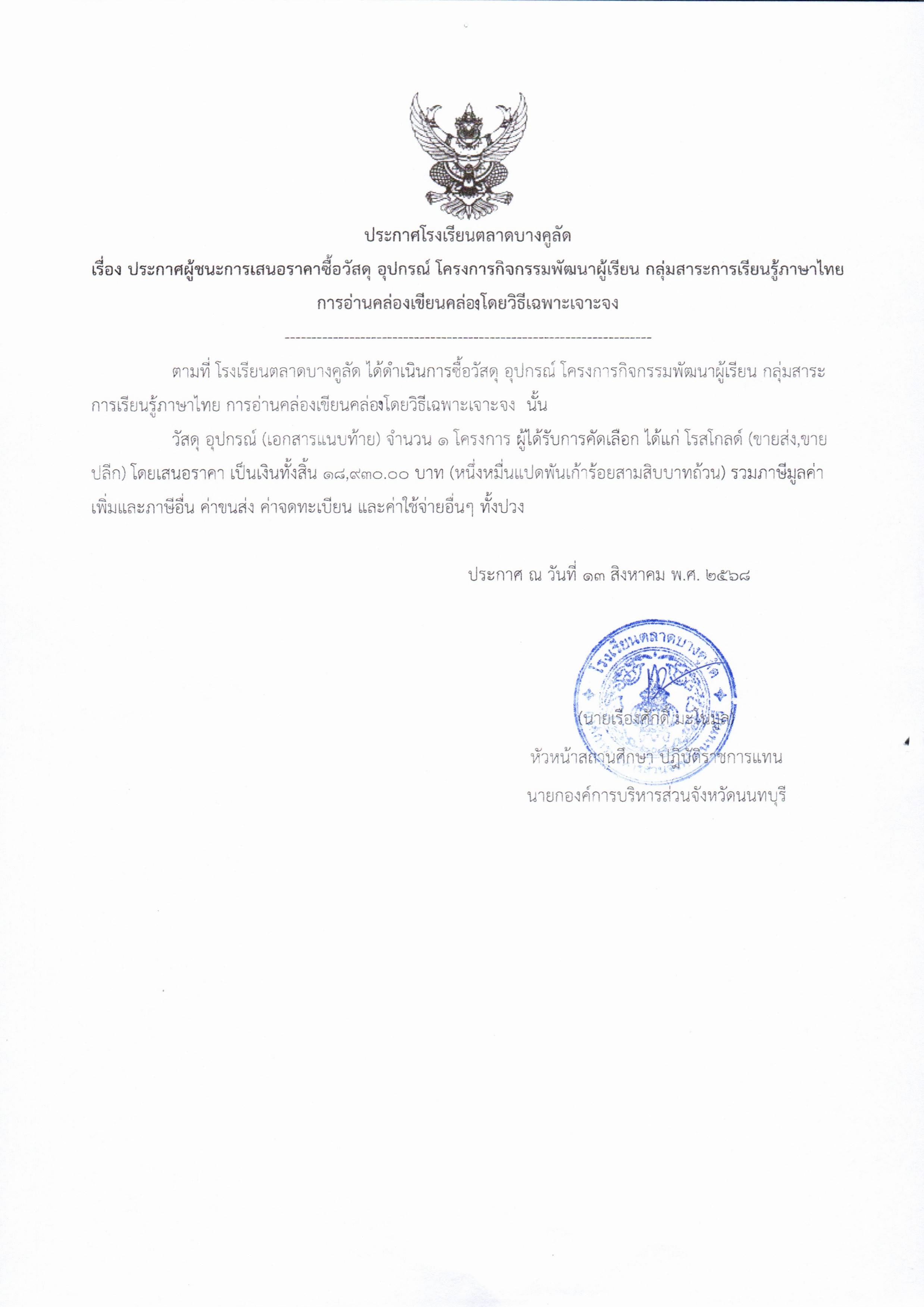 ประกาศจัดซื้อจัดจ้าง โรงเรียนตลาดบางคูลัด เรื่อง ประกาศผู้ชนะการเสนอราคา จัดซื้อวัสดุอุปกรณ์ (โครงการกิจกรรมพัฒนาผู้เรียน กลุ่มสาระการเรียนรู้ภาษาไทย การอ่านคล่องเขียนคล่อง) ประจำปีงบประมาณ 2568 (ฏีกา 121/2568)