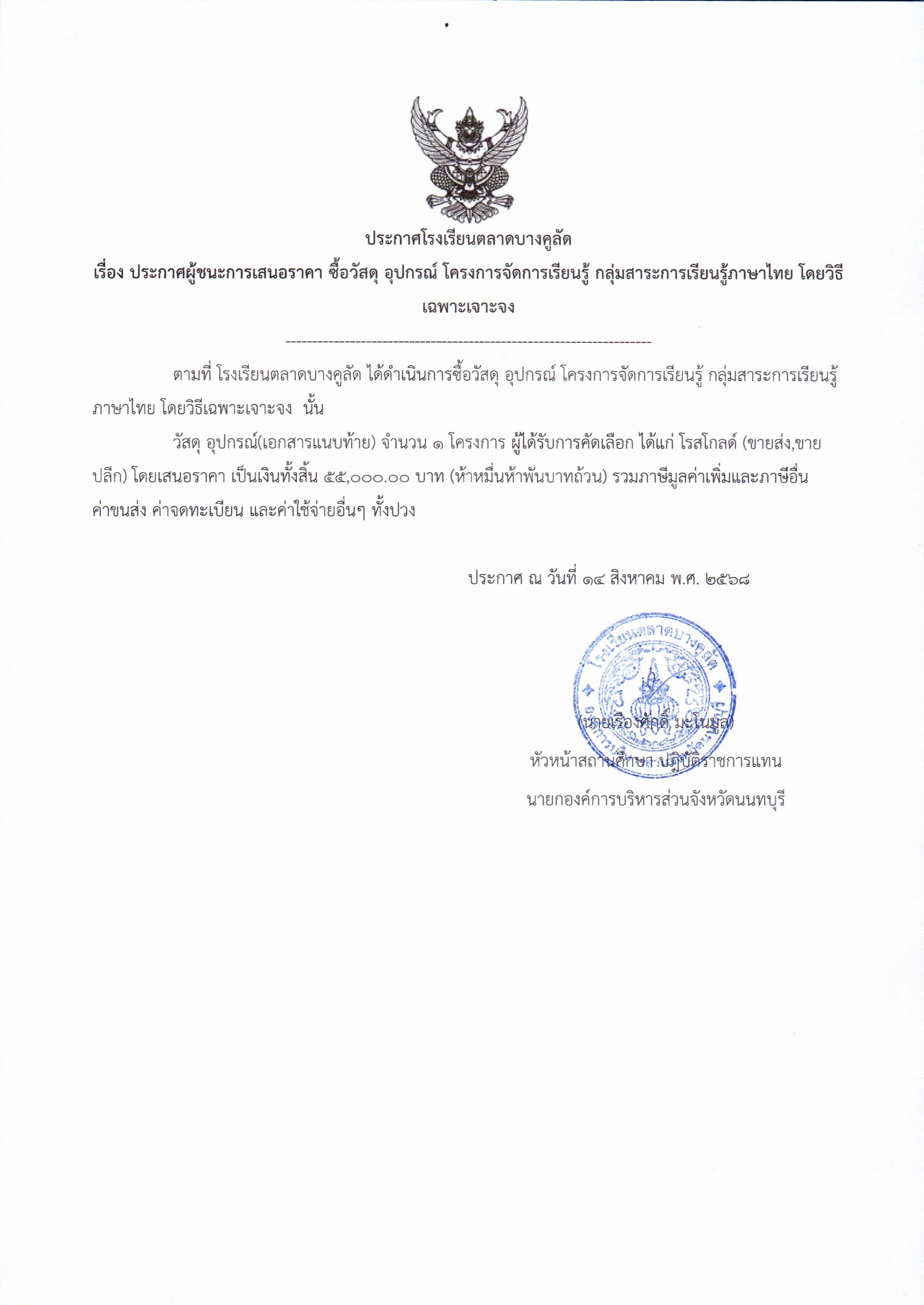 ประกาศจัดซื้อจัดจ้าง โรงเรียนตลาดบางคูลัด เรื่อง ประกาศผู้ชนะการเสนอราคา จัดซื้อวัสดุอุปกรณ์ (โครงการจัดการเรียนรู้ กลุ่มสาระการเรียนรู้ภาษาไทย ) ประจำปีงบประมาณ 2568 (ฏีกา 123/2568)
