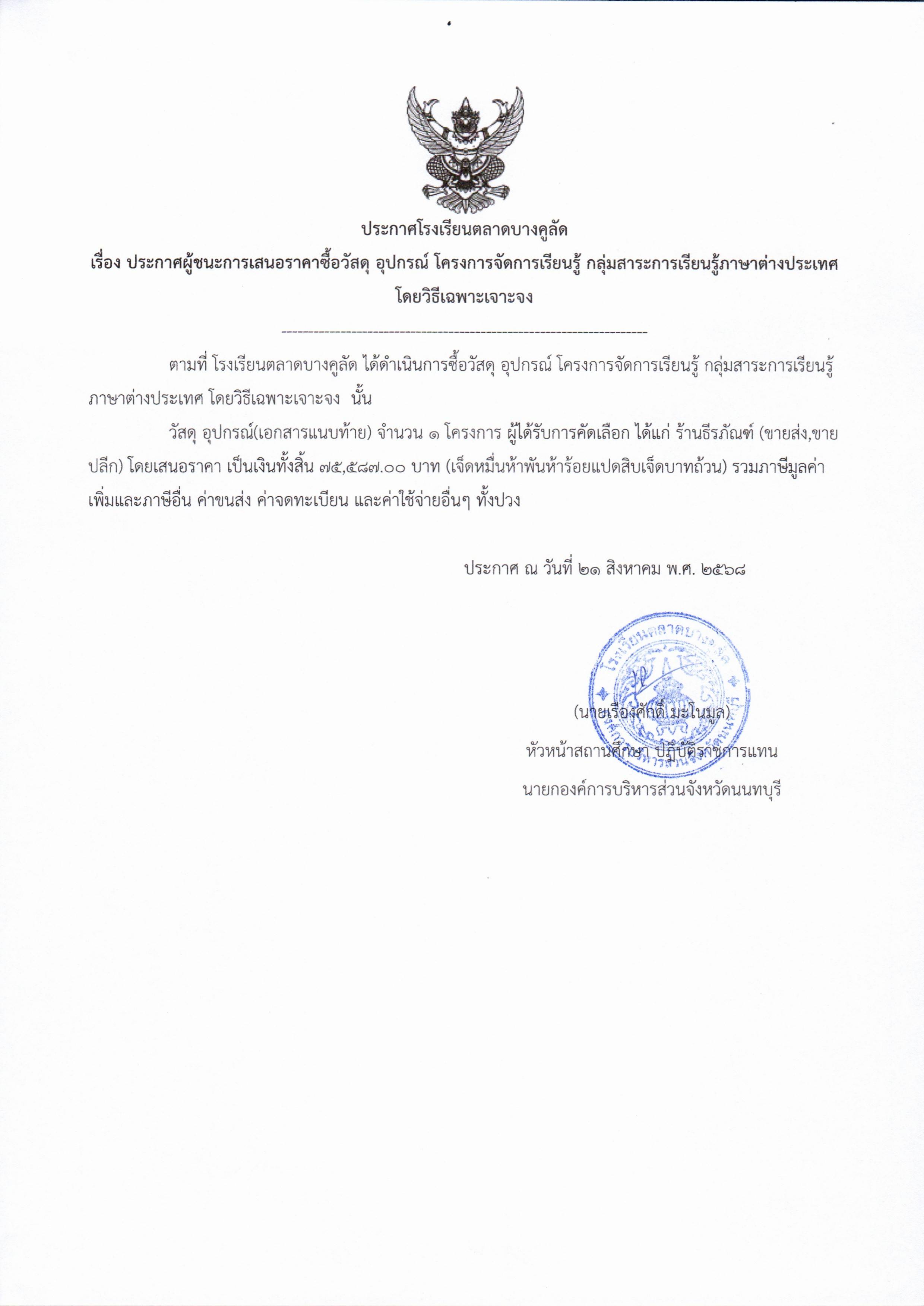 ประกาศจัดซื้อจัดจ้าง โรงเรียนตลาดบางคูลัด เรื่อง ประกาศผู้ชนะการเสนอราคา จัดซื้อวัสดุอุปกรณ์ (โครงการจัดการเรียนรู้ กลุ่มสาระการเรียนรู้ภาษาต่างประเทศ ) ประจำปีงบประมาณ 2568 (ฏีกา 126/2568)